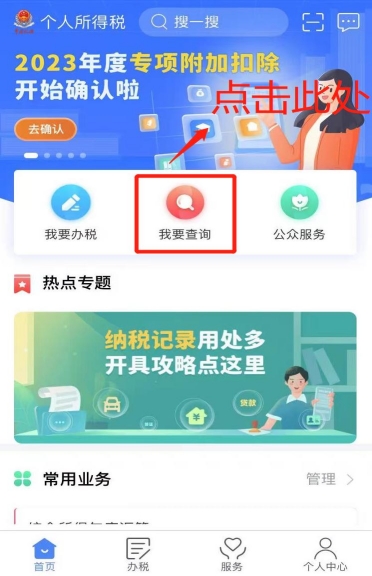 第一步:在个人所得税App首页,选择【我要查询】,选择【专项附加扣除信息查询】再选择扣除年度【2023】;