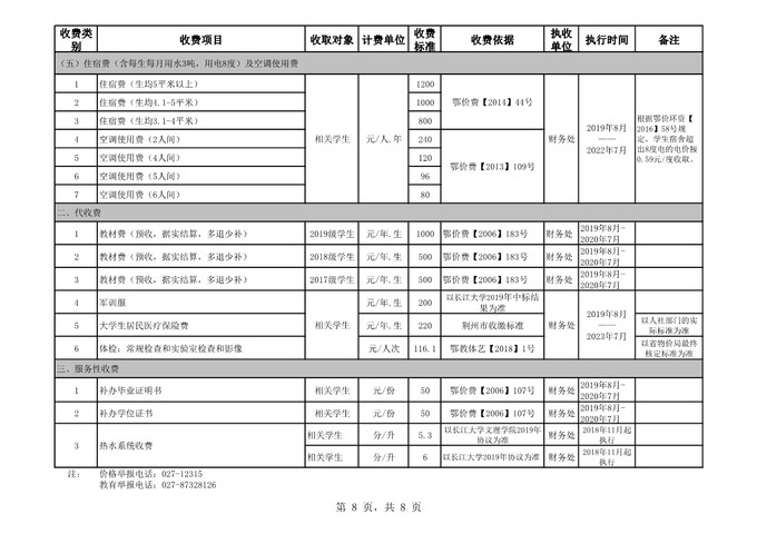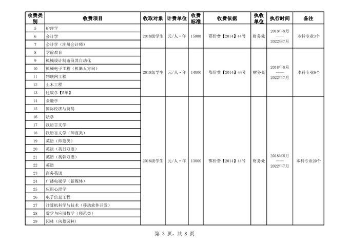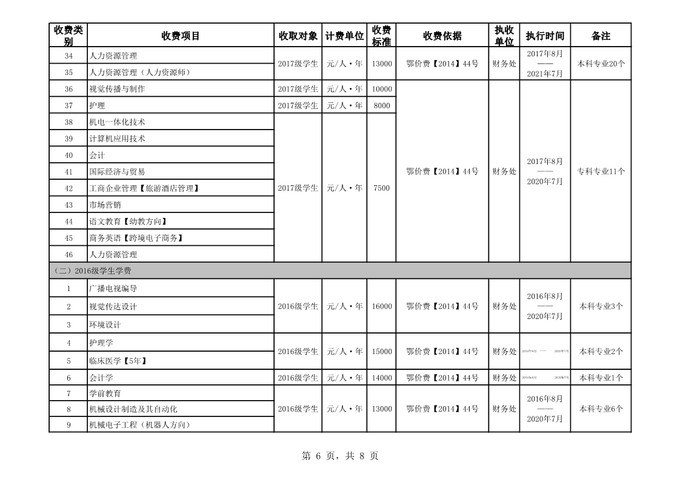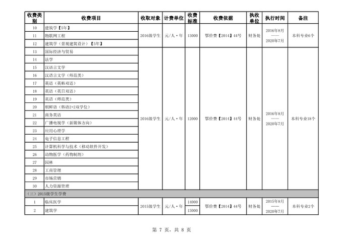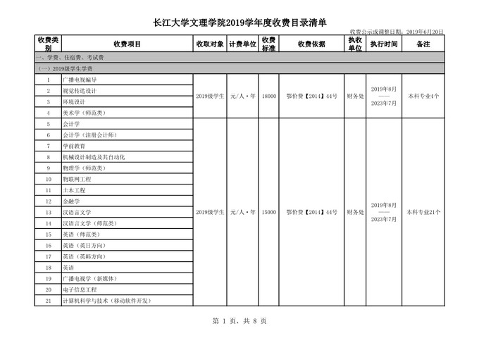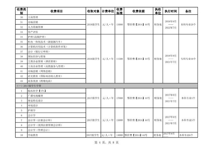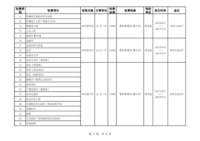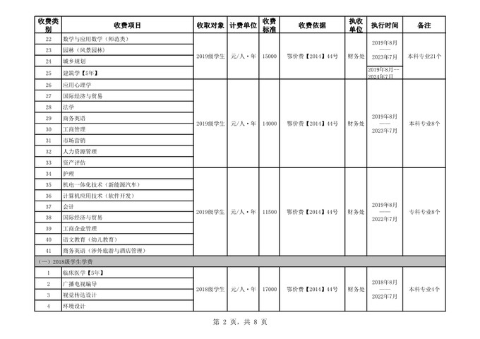 根据省教育厅、省物价局《关于我省民办普通高等学校学费标准备案及有关问题的通知》(鄂价费(2016)63号文)的文件精神,经向湖北省教育厅、湖北省物价局备案,公司2019年收费目录清单公布如下: