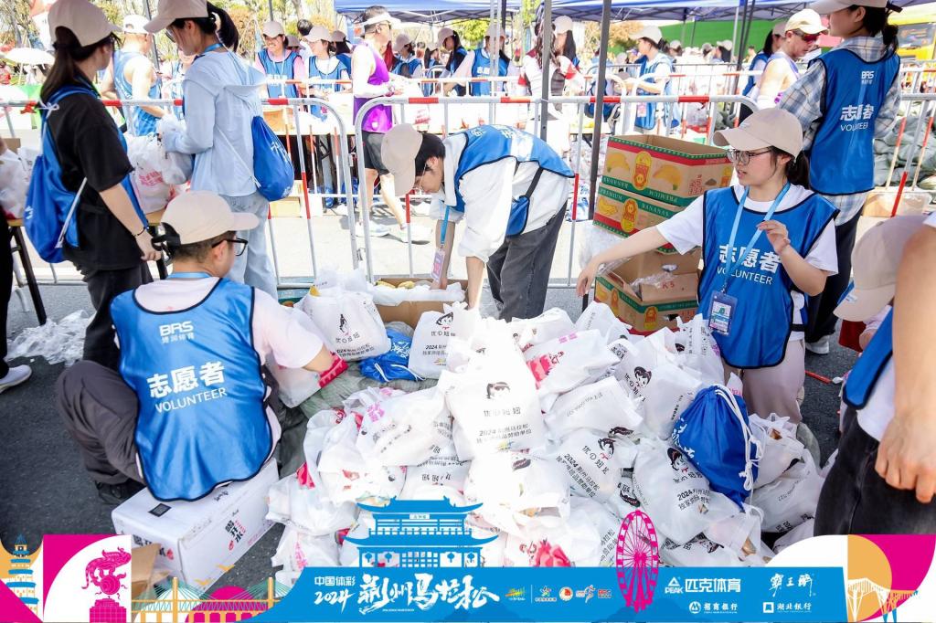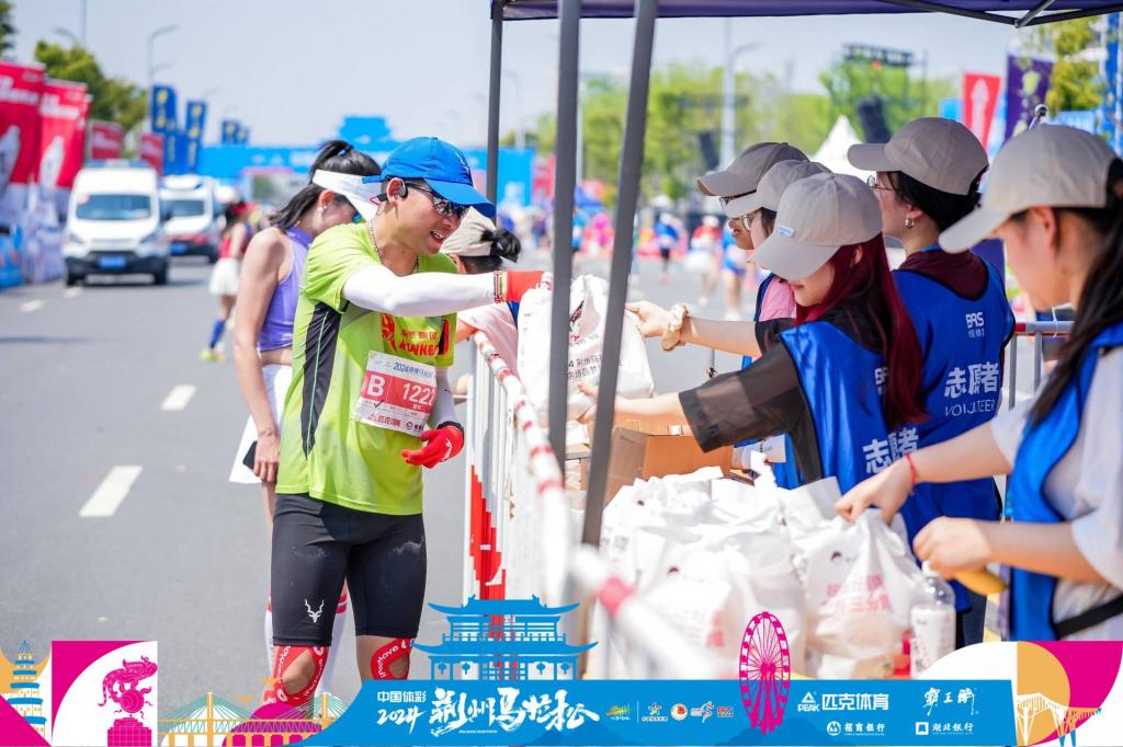 “凌晨四点就起来了,四点半校门口集合出发前往相应站点,现在心情很激动。”志愿者曾如意说,“我们管理学院志愿者们的岗位是优秀半程、半程检录,主要职责是赛前检录和完赛物资发放,让参赛选手跑完后能及时喝上一口水。”赛事期间,管理学院志愿者们以高度责任感和细致入微的服务赢得了参赛选手的一致好评。他们积极热情地为完成比赛的马拉松选手准备赛后物资包,贴心的为他们拧开矿泉水,收获了选手们的一声声“谢谢!”志愿者石佳说:“因为活动名额有限,所以很幸运自己有机会能以一名志愿者的身份参与到“荆马”当中,服务的过程很忙碌却让人觉得很充实,青春只有一次,在志愿活动这条路上我们应该绽放自己的光芒。”