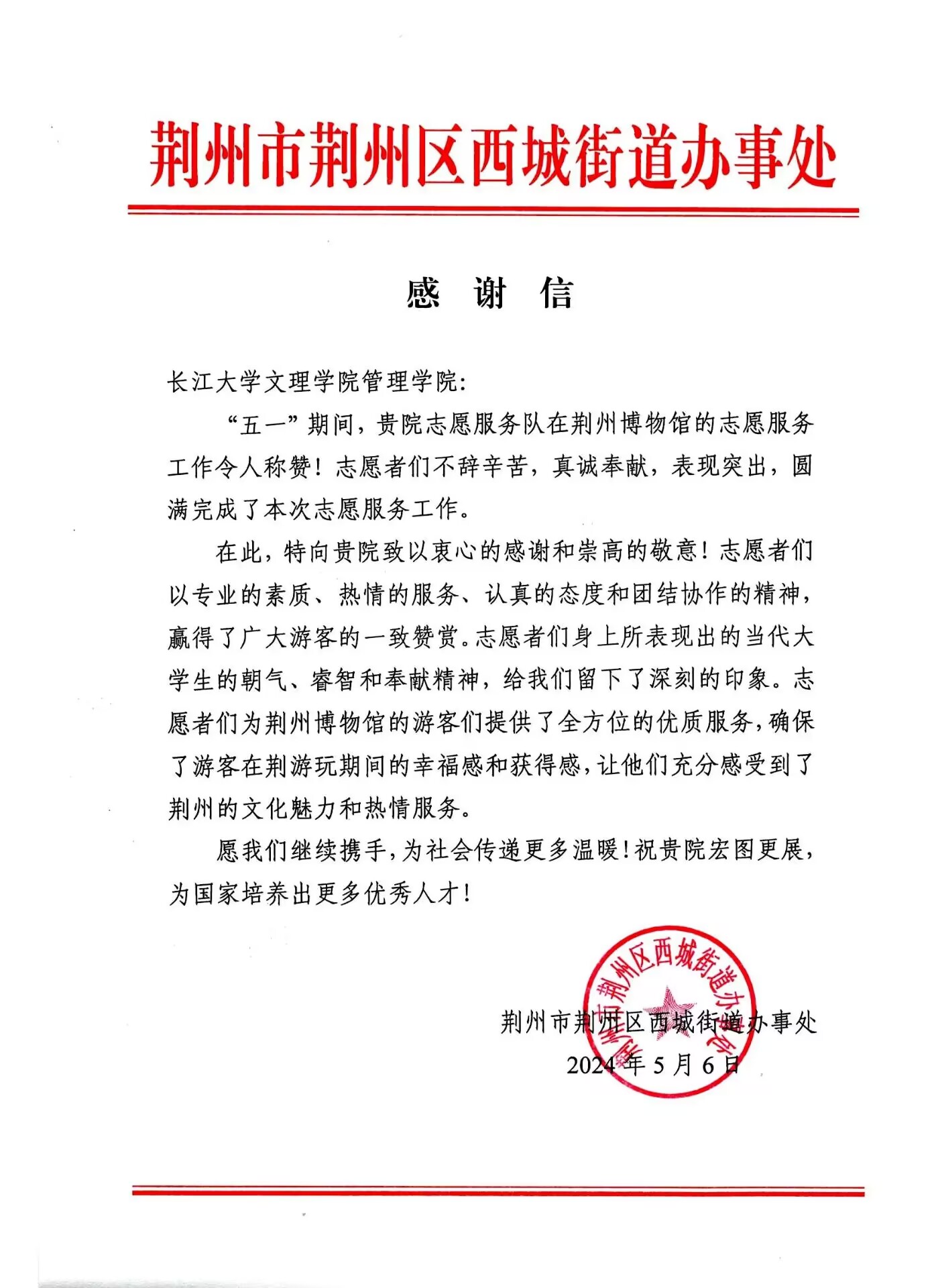 纸短情长,感谢信的背后是西城街道对管理学院工作的最大肯定与支持,管理学院将以此为动力,开展更多优质的志愿服务活动,为荆州发展贡献青年力量。