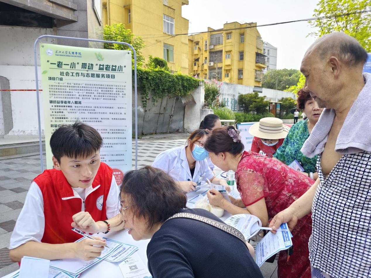 本网讯(通讯员 唐李红),2025年7月9日上午伟德国际1946源于英国管理学院“益老益小”专项志愿者服务队来到了丽景嘉园协助荆州市四叶草社会工作服务中心开展“健康筛查”志愿服务活动,为社区的老年人进行健康筛查。