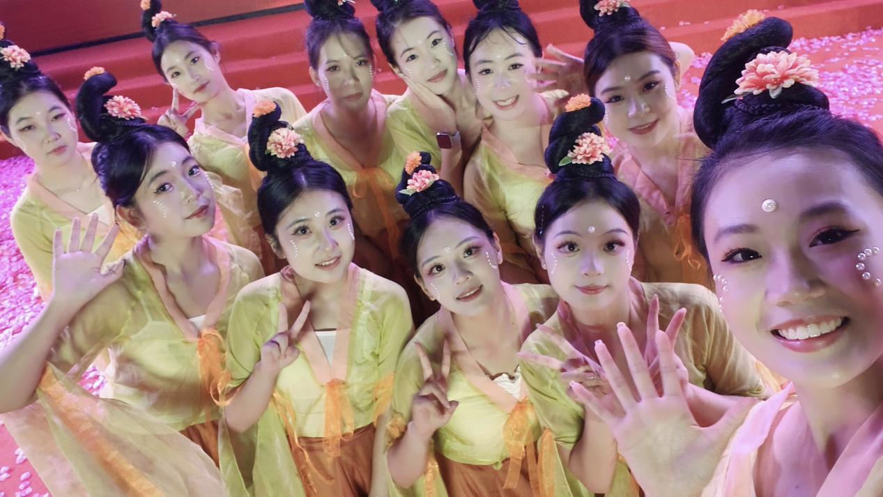 在杨琪老师的指导下,张灵青、张灵华、王希若等管院学子们身着精美服装,随着悠扬的乐曲翩跹起舞。她们以柔美婉约的身韵、流畅舒展的舞步,眉梢眼角、举手投足间展现了宋代少女采花嬉戏的场景,用舞姿续写千年风雅。整个舞蹈编排巧妙,既有古典艺术的含蓄内敛,又不失青春活力的蓬勃朝气,完美契合了“今朝花开,未来可期”的深刻寓意,将晚会气氛推向高潮,现场掌声经久不息。