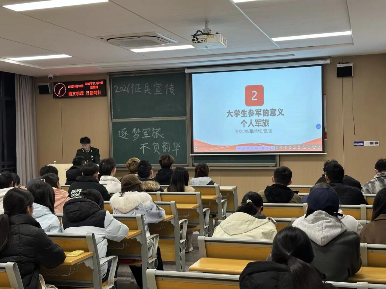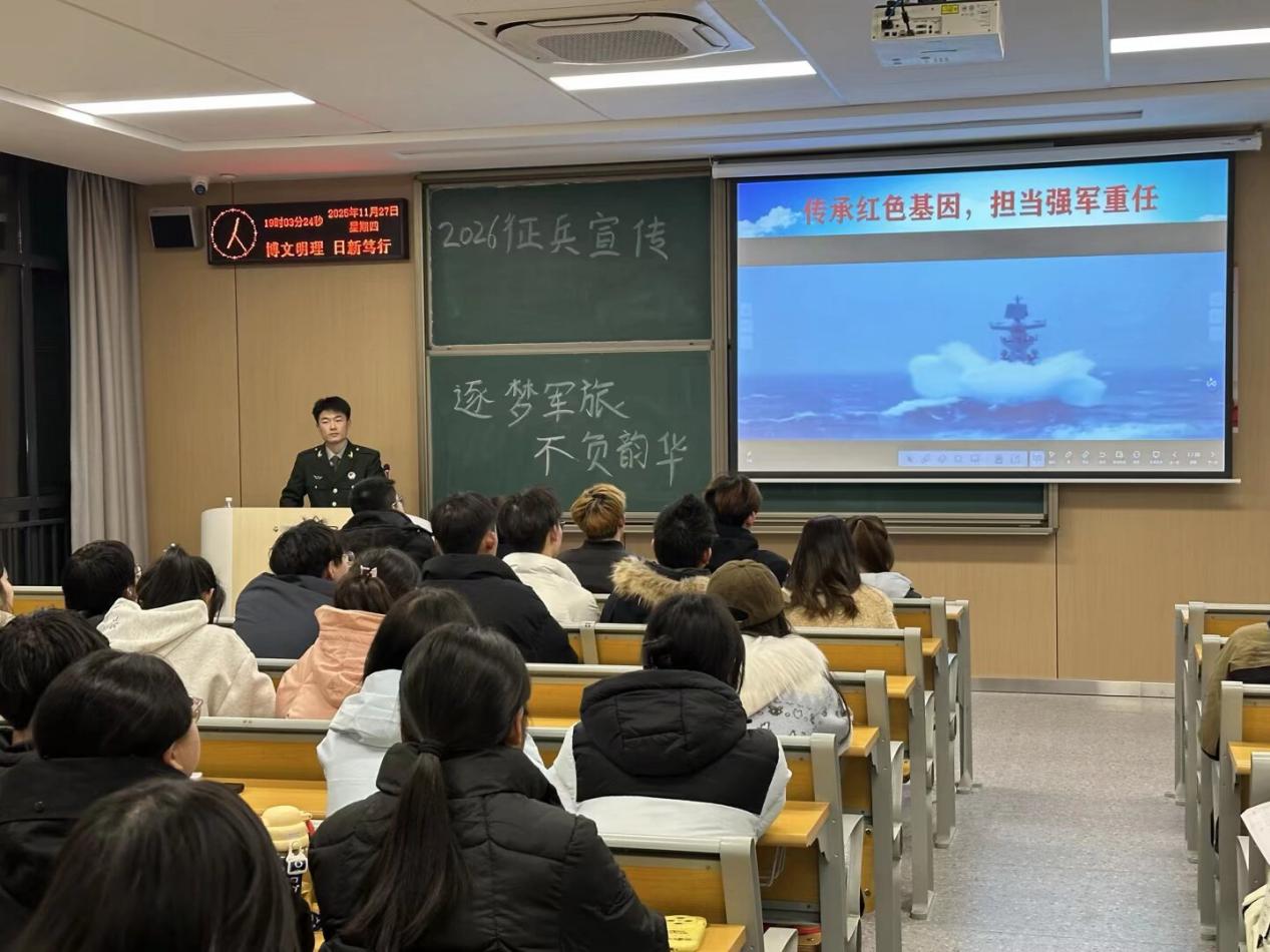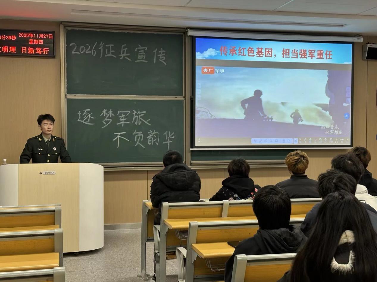 本网讯(通讯员 杜锡熳)为深入贯彻落实2026年征兵工作部署要求,切实激发青年员工参军报国的责任感与使命感,11月27日,由管理学院组织的2026年征兵宣传专题宣讲会顺利举行。本次宣讲会以“逐梦军旅,不负韶华”为主题,特邀工商管理s5251班刘传海担任主讲人。