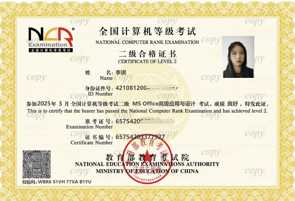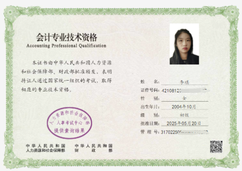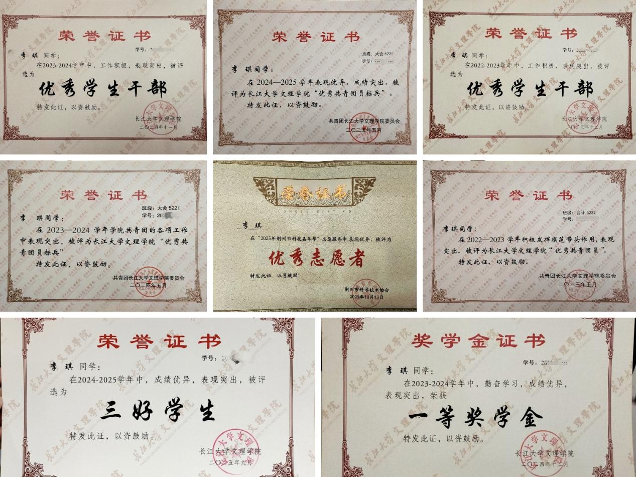 李琪连续两年获学院一等奖学金,多门课程成绩位列专业前列,43门课程85+,30门课程90+,线性代数B100分,成本会计99分,财务管理99分,获三好员工荣誉称号。她已考过计算机二级、初会、普通话二甲、英语四级。