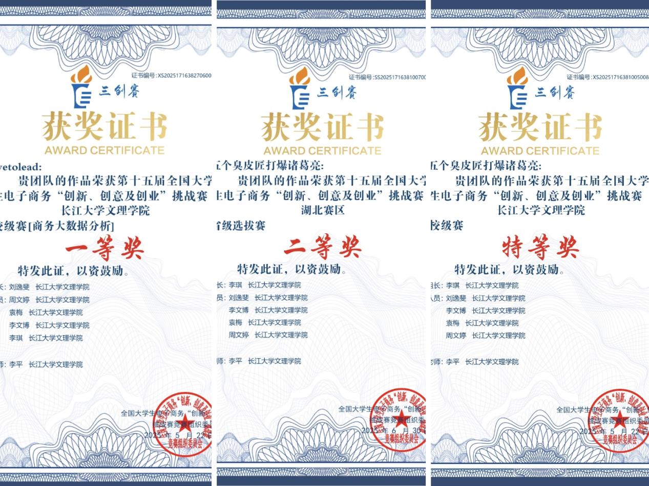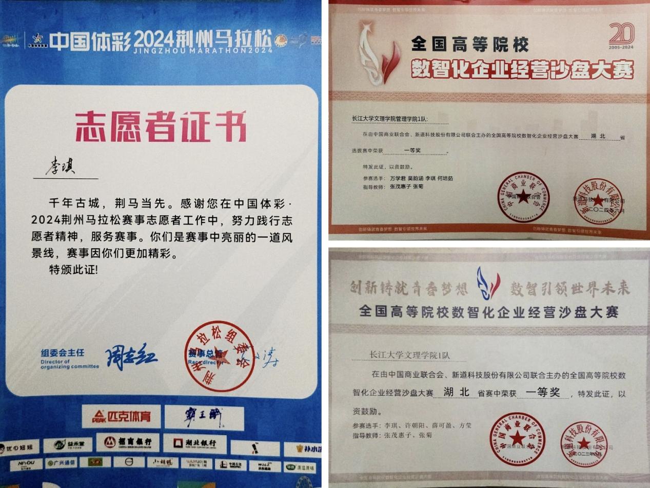 李琪获第十九届全国高等院校数智化企业经营沙盘大赛湖北省一等奖;获第二十届全国高等院校数智化企业经营沙盘大赛湖北省一等奖;获第十五届全国老员工电子商务“创新、创意及创业”挑战赛一个校级一等,一个校级特等,一个省级二等。