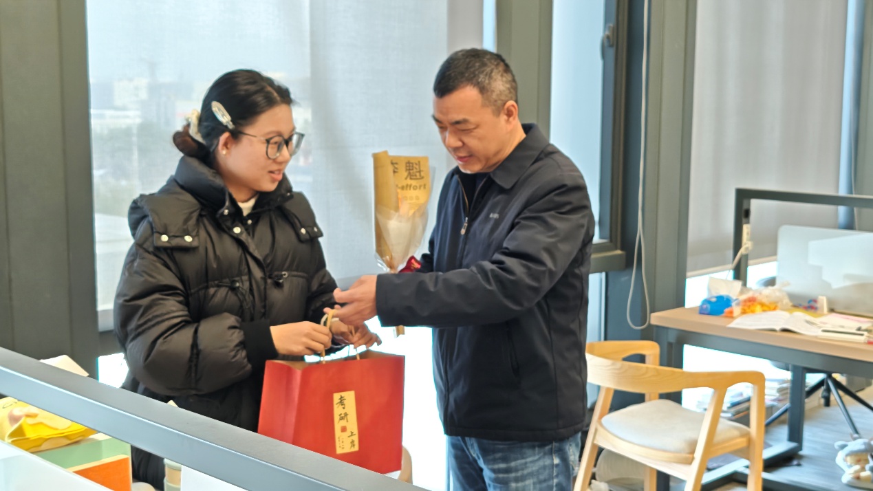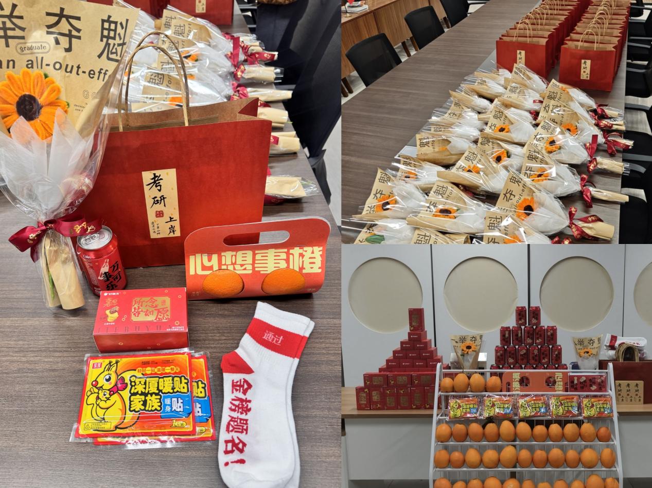 公司精心筹备的“暖心备考包”细致周到、寓意深远,包含暖宝宝、金榜题名袜、橙子、可乐、薯片以及一束由员工志愿者亲手制作的向日葵花束。其中,暖宝宝抵御严寒,呵护身心;袜子在保暖的同时也寓意“稳步前行”,踏踏实实走好备考每一步;橙子象征“心想事成”,寄托对学子们取得佳绩的美好祝愿;可乐代表“乐观向上”,期待同学们保持积极心态;薯片则寓意“薯你最棒”,为复习生活增添轻松一刻。而向日葵始终朝向阳光,象征着希望、信念与不懈追寻,寓示“心向朝阳、一举夺魁”。每一份礼物都承载着学院师生对考研学子最诚挚的鼓励与关怀,让同学们倍感温暖与惊喜。