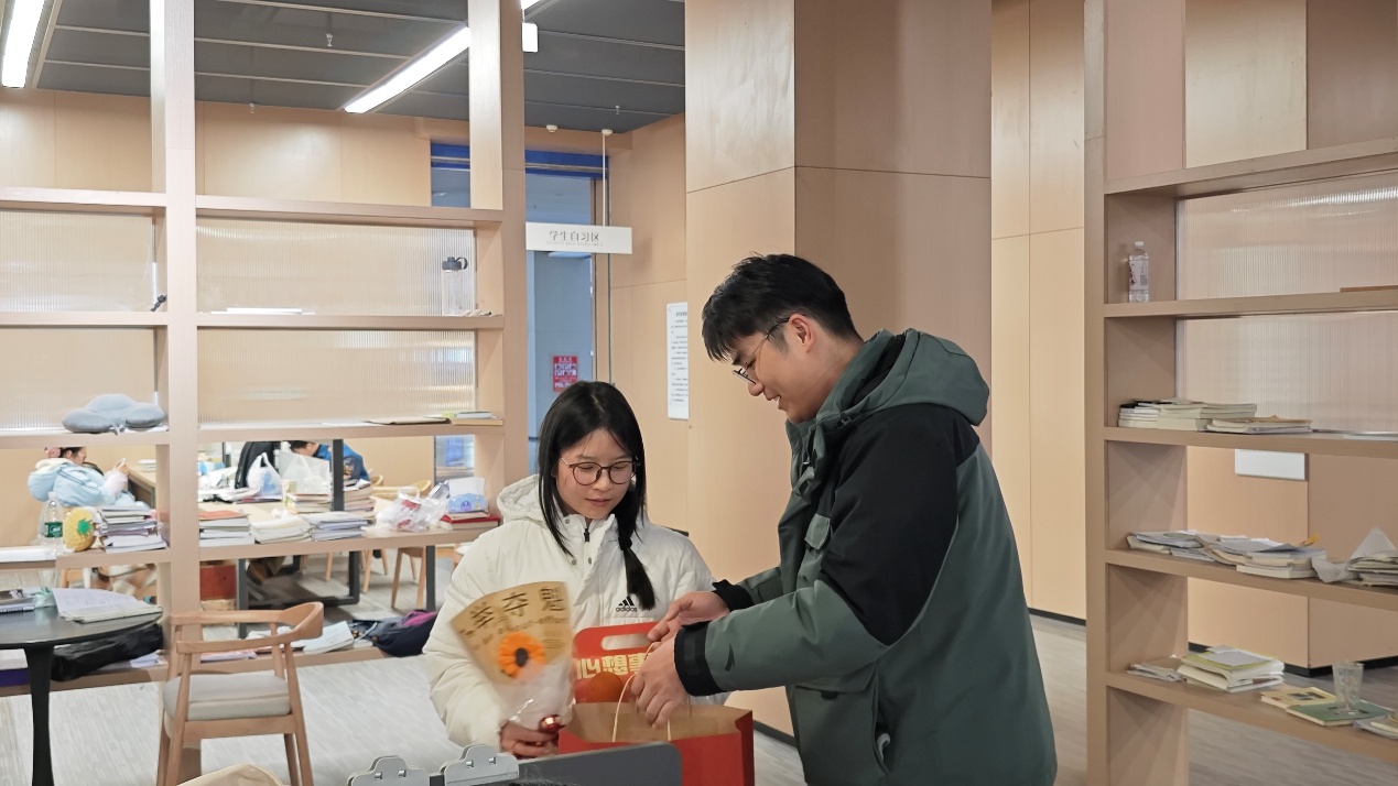 在静谧的图书馆学习区,老师们轻轻走到伏案疾书的同学们身边,将一份份满载心意的礼包送至学子手中,并低声与大家交流,细致询问复习安排、备考状态与实际困难,叮嘱同学们在冲刺阶段要合理安排时间,注重身心健康,保持积极乐观的心态,自信迎考。“在备考路上遇到任何困难或压力,都可以随时向老师们寻求帮助,学院始终是大家最坚实的后盾”一位老师亲切地说道。