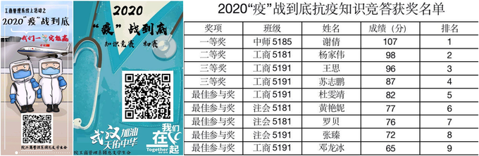 本网讯(通讯员 黄雅君)2020年春,在全国疫情形势向好情况下,我系为进一步强化员工疫情防控意识,掌握防疫的各种技能,同时向英雄和逆行者致敬,于4月28~30日举办了“疫”站到底知识竞答活动。本次活动由系团总支纪检部承办,题目主要围绕防疫知识和防疫英雄图片进行考察,外加一些活跃思维的脑筋急转弯,采用新媒体线上答题形式统一制作问卷。活动分初赛和决赛两期,共计112人参与线上答题,经过重重筛选与综合成绩的评定,12名同学突出重围,荣获奖项,活动效果良好。
