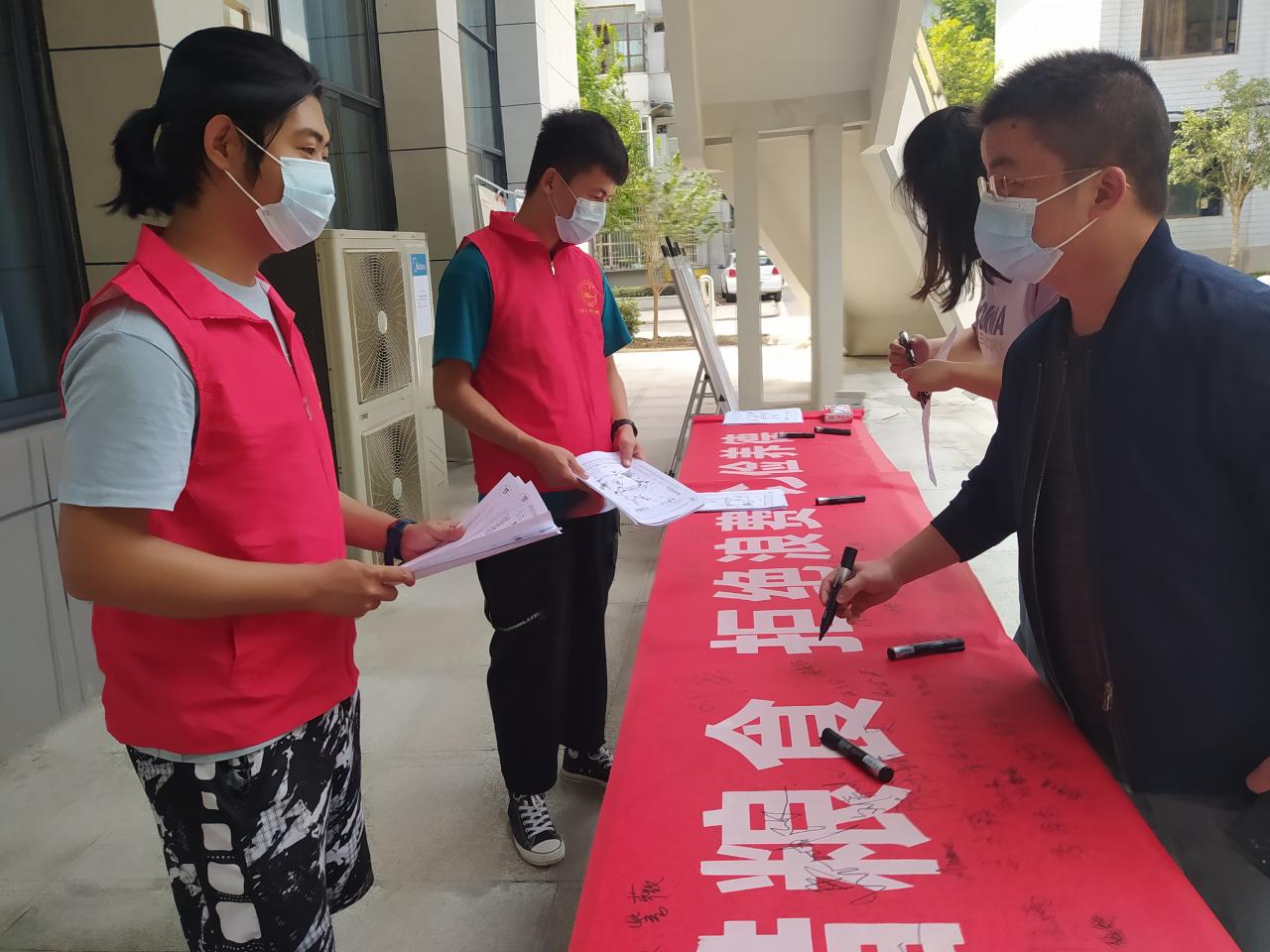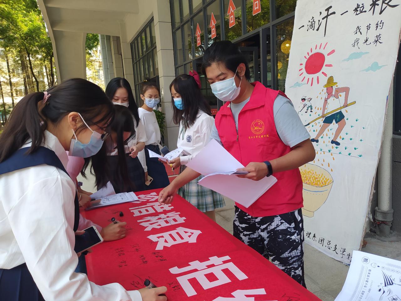 我系志愿者在食堂门口开展活动