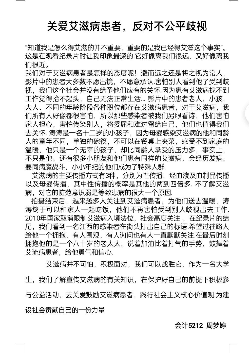 通过此次活动同学们对艾滋病有了更多的了解,也学会了应该如何正视艾滋病。以更好地遏制艾滋病的传播与蔓延,从影视中也展现了艾滋病病毒感染者与艾滋病病人热爱生活、珍视生命、积极向上的精神风貌。同学们表示此次活动的开展让我们受益良多,并且有着许多的感触,会计5212的张英豪表示“看了这部纪录片,不仅让我对艾滋病有了科学的了解,对艾滋病人的需求有基本的认识,也让我对这个社会添加了一份同情,我们要尊重艾滋病人,不要歧视他们,他们需要的仅仅是一个简单的拥抱和关爱。”亦有很多同学有着多样的不同感受,此次活动的意义重大,也圆满成功。在今后的学习工作中, 希望能够通过更多的活动让同学们增长知识,增加感同身受的热心和责任感。