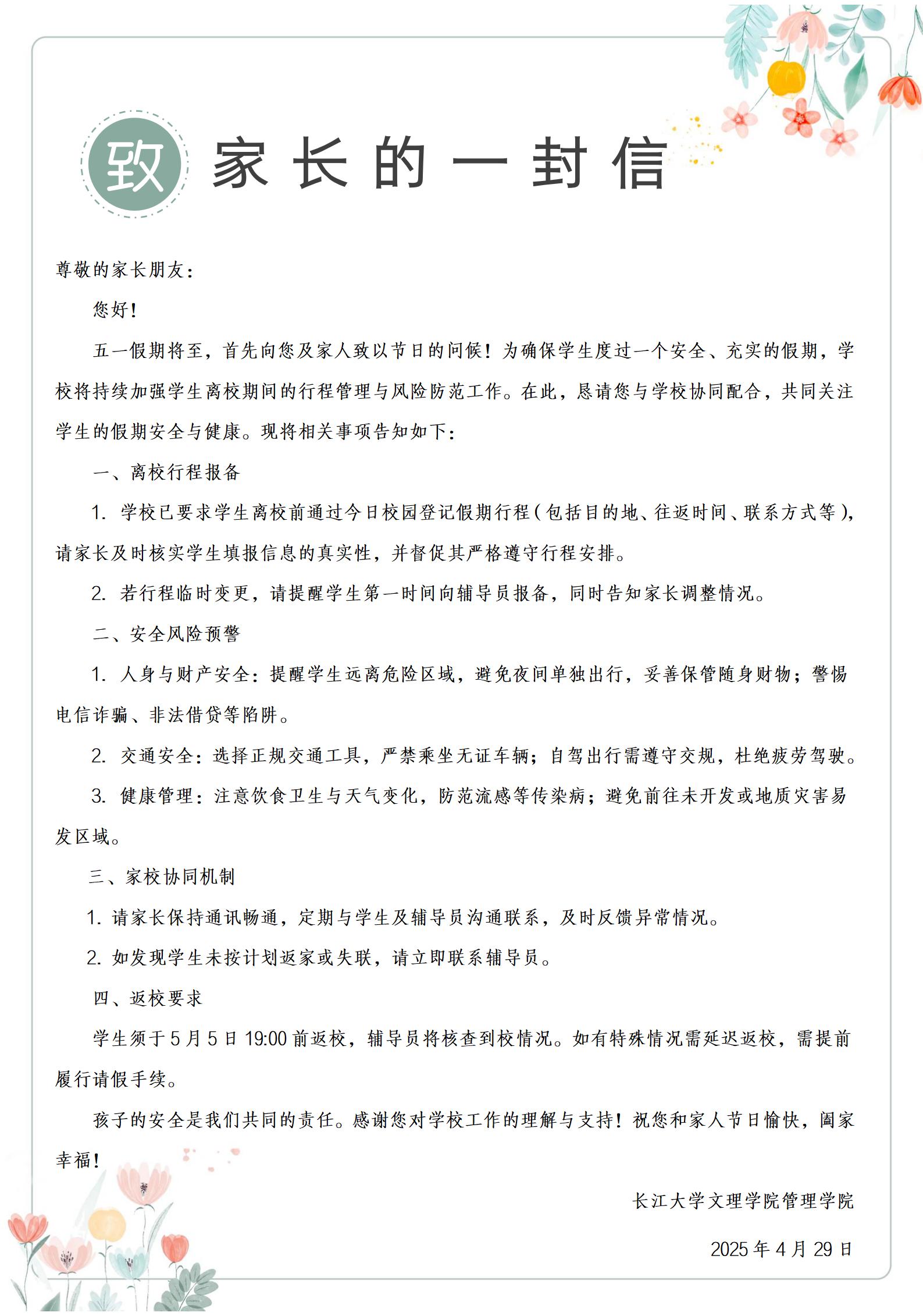 通过此次主题班会,学院全体员工的安全意识得到了进一步增强。同学们纷纷表示,将严格遵守学校的安全规定,做到自觉自律,确保假期安全,全体员工还在节前签署了《假期安全告知书》,在今日校园登记假期去向。同时,学院也推动家校联动,在家校群发送《致家长的一封信》,告知家长协同落实离校员工行程追踪与风险预警。