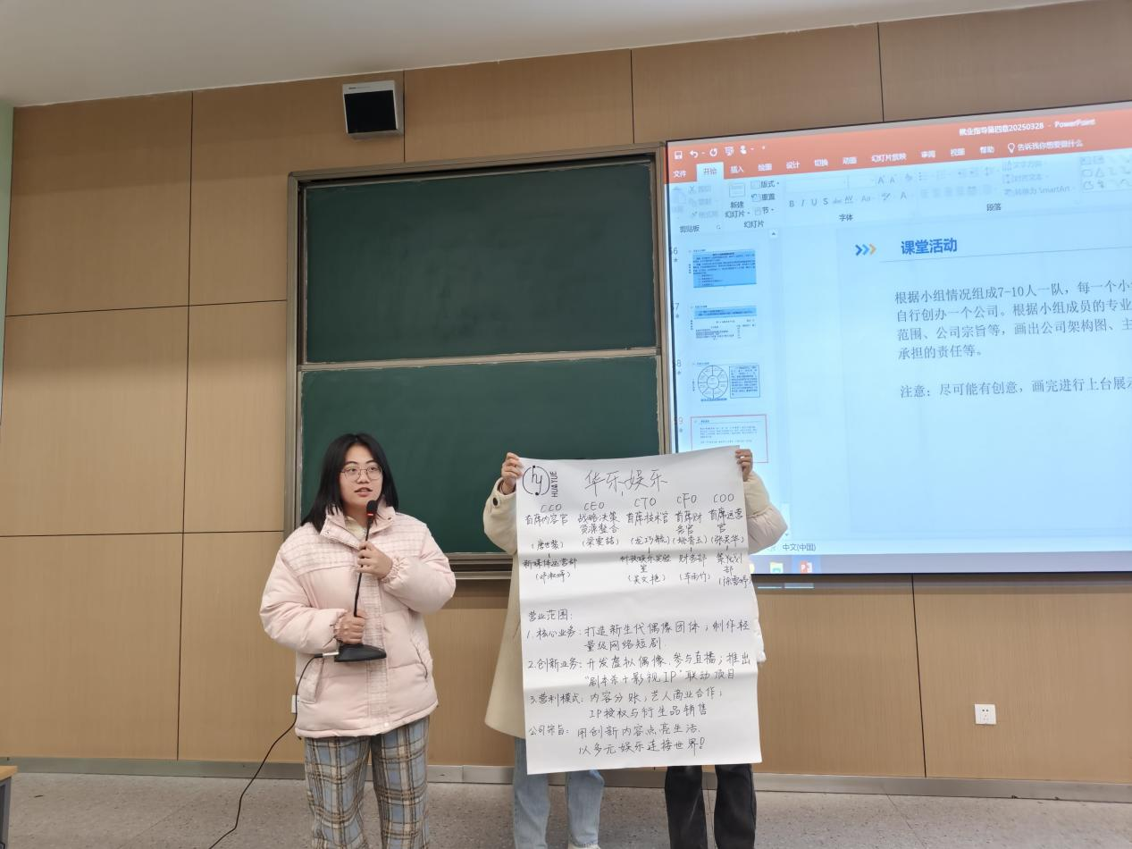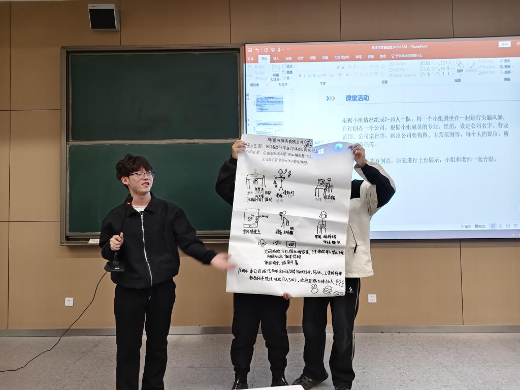 在领取白纸和马克笔后,各团队迅速投入创作。教室内讨论声此起彼伏,各组围绕投影提示的“公司名称、主营业务、架构图”等要素展开头脑风暴。其中,张灵华小组打造的“华乐娱乐公司”令人眼前一亮。其手绘架构图中,艺人培训、粉丝运营、IP开发等部门环环相扣,并创新性提出“偶像+短剧”的融合计划。“我们要培养有文化底蕴的新时代爱豆!”组员龙巧毓在展示时说道。其他小组同样创意纷呈:有团队开发游戏平台,有小组策划教育辅导学习营,还有团队设计财务公司......白纸上跃动的不仅是马克笔的线条,更是年轻学子对未来职场的无限想象。