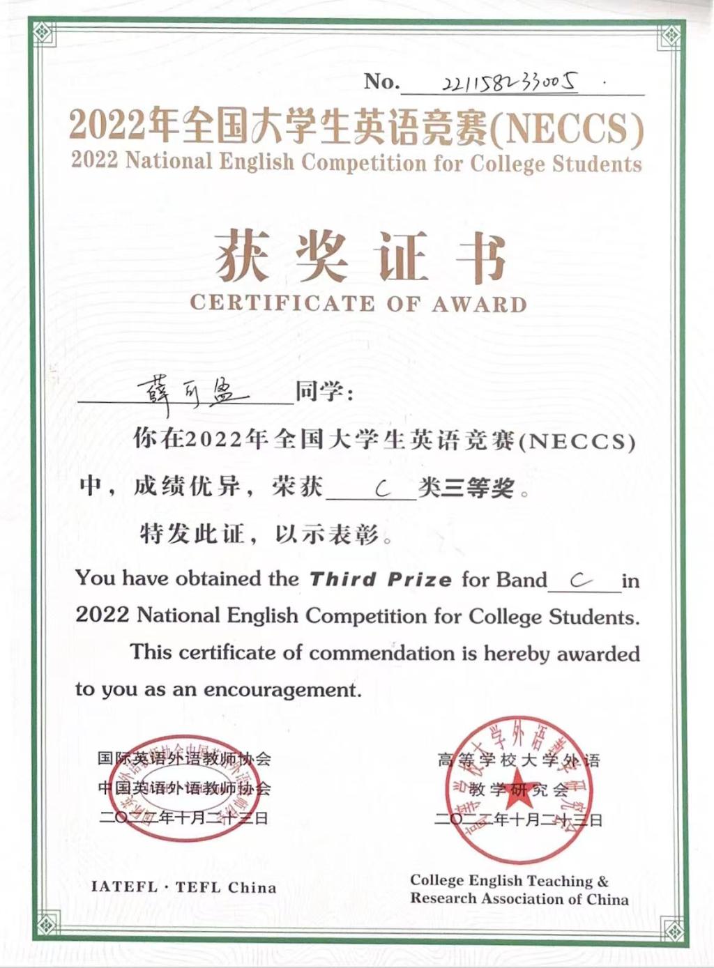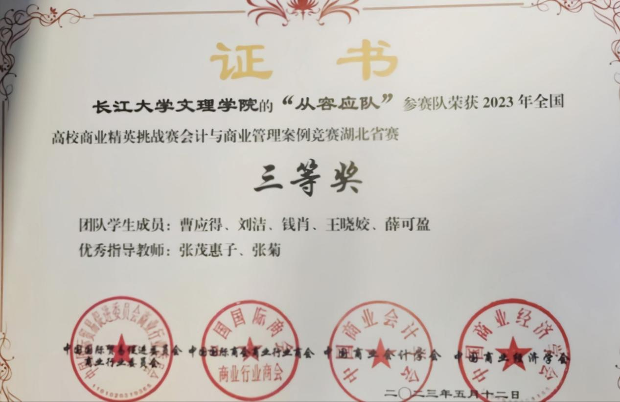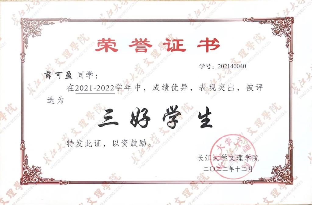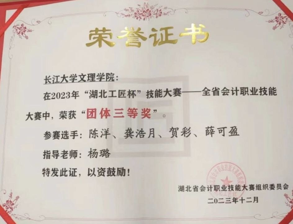 主要获奖情况:荣获学院一等奖学金等,获得三好员工,优秀共青团员、优秀共青团标兵等荣誉称号7余次。2022年4月,获“预爱予爱,你我同在”知识技能竞赛团体二等奖;2022年5月,获校级“优秀共青团员”荣誉称号;2022年6月,获第十八届“新道数智人才杯”全国老员工数智化企业经营沙盘大赛一等奖;2022年6月,通过大学英语四级证书;2022年12月,获学校一等奖学金;2022年12月,获校级“三好员工”荣誉称号;2022年12月,获全国老员工英语竞赛三等奖;2023年6月,获全国高等院校数智化企业经营沙盘大赛湖北省一等奖;2023年5月,获全国高校商业精英挑战赛会计与商业管理案例竞赛湖北省省赛三等奖;2023年12月,获全国老员工英语翻译大赛三等奖;2023年12月,获学校一等奖学金荣誉称号;2023年12月,获湖北省“工匠杯”技能大赛全省职业技能大赛团体三等奖;2024年2月,通过大学英语六级;2024年4月,获校级“优秀共青团员标兵”荣誉称号;2024年5月,获“第九届十佳老员工荣誉称号”。