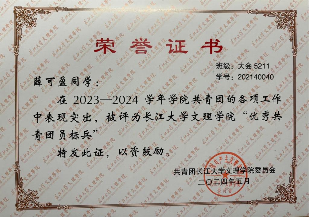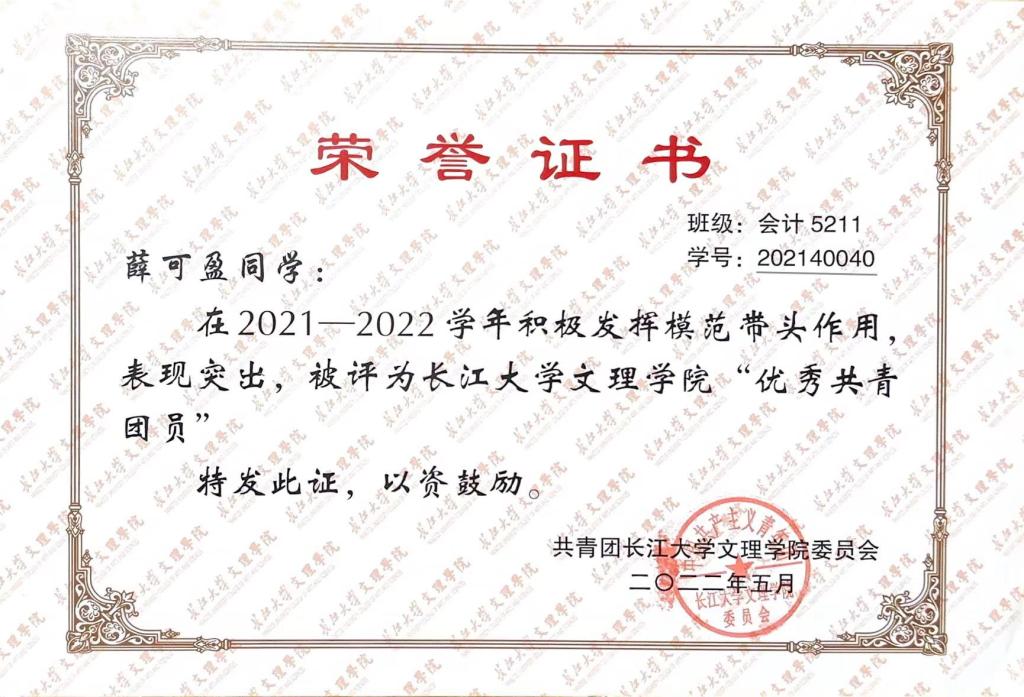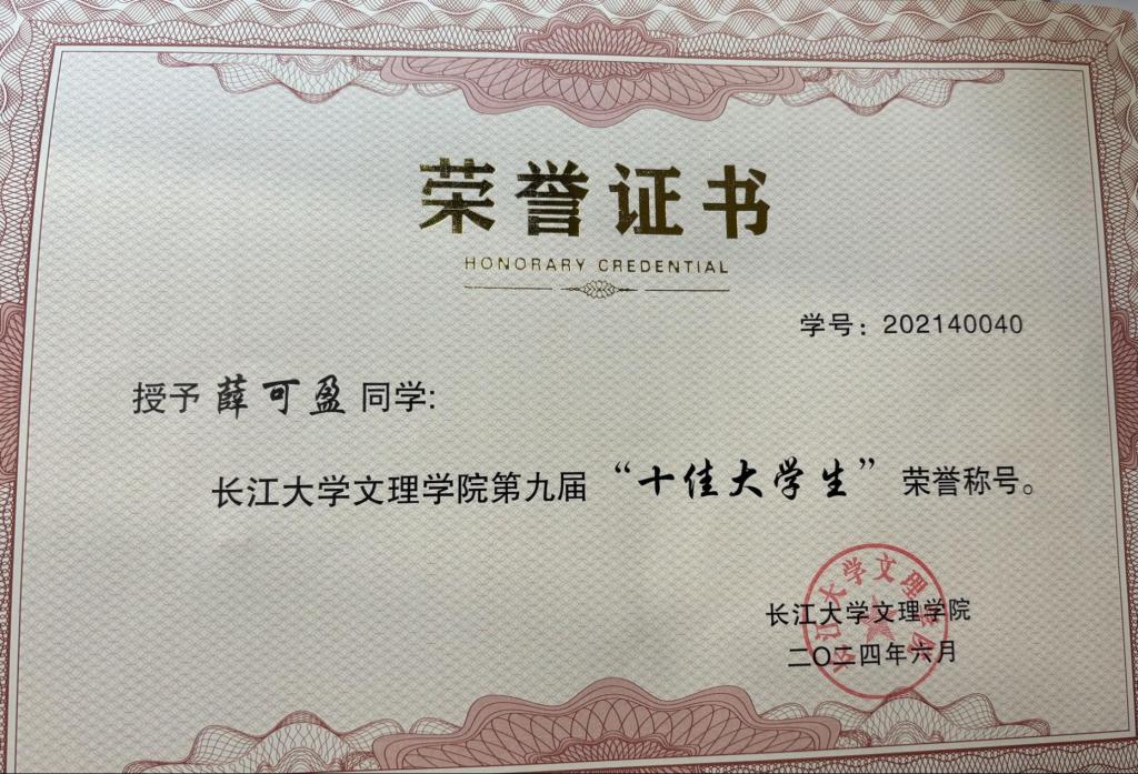 苔花如米小,亦学牡丹开。薛可盈同学表示这句话的意思是尽管吾辈老员工是平凡人,如空气中的尘埃一样渺小,如石头上的青苔一样不起眼,却可效仿苔花,虽如米小,也学牡丹开,承担起责任与担当。笃学不倦,攀登学术巅峰—方成中坚之才,自踏入文理学堂以来,她以优秀的学长学姐为榜样,从他们的身上汲取笃行的力量,经过不懈努力,连续两个学年,专业成绩与综合测评成绩均列第一,三学年平均绩点3.96,专业课98%达85分及以上,连续两年获得学院一等奖学金,被评为三好员工。除了在专业学习上的努力,英语方面的学习也一直在路上。四六级顺利过线,其中四级听力接近满分;此外,她积极参加英语类学科竞赛,均取得不错的佳绩。当然,抬头望骄阳长空,跬步行追光之路,在初级会计师考试中,双科顺利过线近20分。“人生是旷野而非轨道”,在这片创新的旷野上,除了有学识,还要潜心科研-勇闯创新前沿,在2023年12月她参加了湖北省工匠杯-会计职业技能大赛;初赛,同297家企事业单位、院校共9139名参赛者进行专业知识的角逐,成功晋级决赛,最后环节,薛可盈将所学的专业知识在财会业务技能竞赛和涉税业务技能竞赛运用至尽,荣获三等奖的好佳绩。 摸着初心与热情,她与数智化双向奔赴。其中,在第十八届“新道数智人才杯”全国老员工数智化企业沙盘大赛中,她紧跟跟随团队在省赛赛场上披襟斩击,最终成绩超越数十所高校,约100只队伍,成功晋级国赛。至此,薛可盈两次参加全国高校数值化企业沙盘大赛均获一等奖。生逢其时勇争先,踔厉奋发立潮头,2021年的夏天的开学典礼,让她便有了志向,志在入党,志在为党;在思想上,她有着明确的政治立场,遵纪守法,勇于自我反思和自我批评,为社会主义建设奉献绵薄之力。作为一名青年学子,薛可盈铭记自己的任务使命,她曾担任社团协会副会长,带领团队外出参加比赛,为校争光;同年,承蒙关照,我荣获第九届“十佳老员工”的荣誉称号。