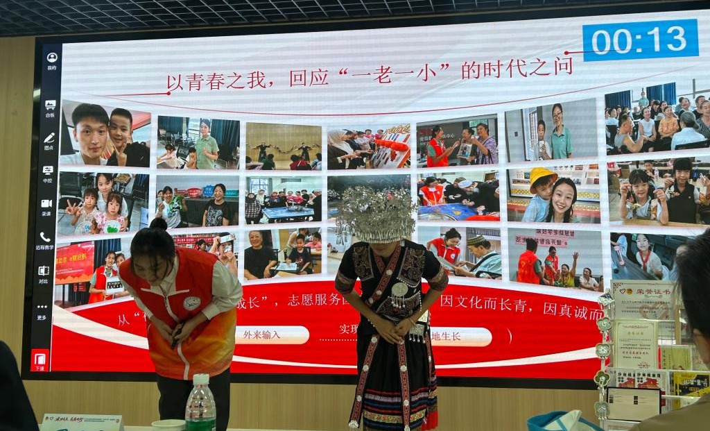 赛前准备阶段,为呈现最好的舞台效果,服务队成员在杨琪老师和李晗明老师的悉心指导下,聚在一起反复打磨稿件和PPT,将汇报时长精准控制在5分钟以内。同时,准备了一系列关于服务内容的文创产品,让志愿服务 “看得见、记得住、传得开”。