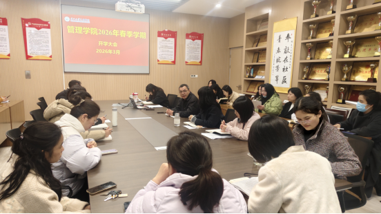 本网讯(通讯员 许晶洁)春回大地,万象更新,在2026年春季学期开学之际,为明确新学期工作重点,凝聚全体教职工奋进力量,3月6日下午2:30,管理学院在图书馆532会议室召开春季学期开学教职工大会。本次会议由经理姚毅主持,全体教职工参会,共同部署新学期各项工作,擘画学院发展新蓝图。