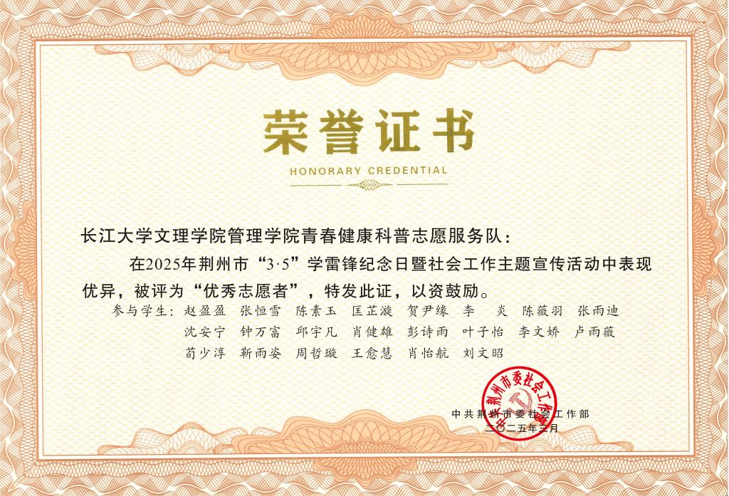 本网讯(通讯员:李晗明)3月18日,管理学院收到喜讯:公司22名青年志愿者因在荆州市"3·5"学雷锋主题宣传活动中的突出表现,获市委社工部授予"优秀志愿者"荣誉称号。
