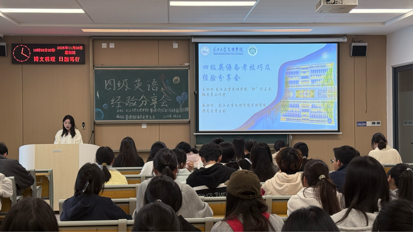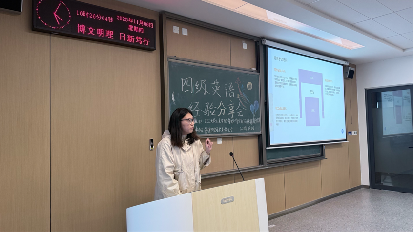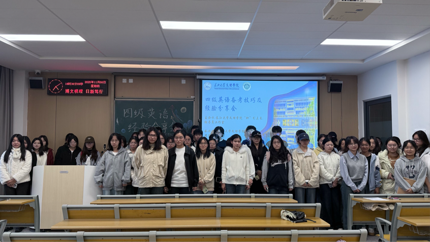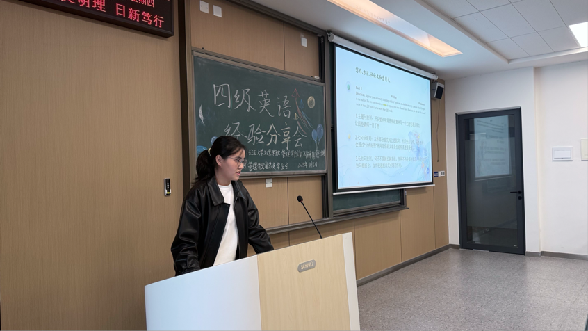 本网讯(通讯员 梁若暄)为帮助同学们更好地备战大学英语四级考试,提升应试技巧与信心,管理学院于2025年11月6日(周四)下午16:00,在C-422教室举办“四级英语备考技巧及经验分享”活动。活动特邀两位高分通过考试的同学——注会5231班吴文娟和张文力,围绕听力突破、阅读提速、翻译得分、写作技巧等核心模块展开分享,助力员工们高效复习,精准提分!本次分享会由会计类5251班王李娟主持。