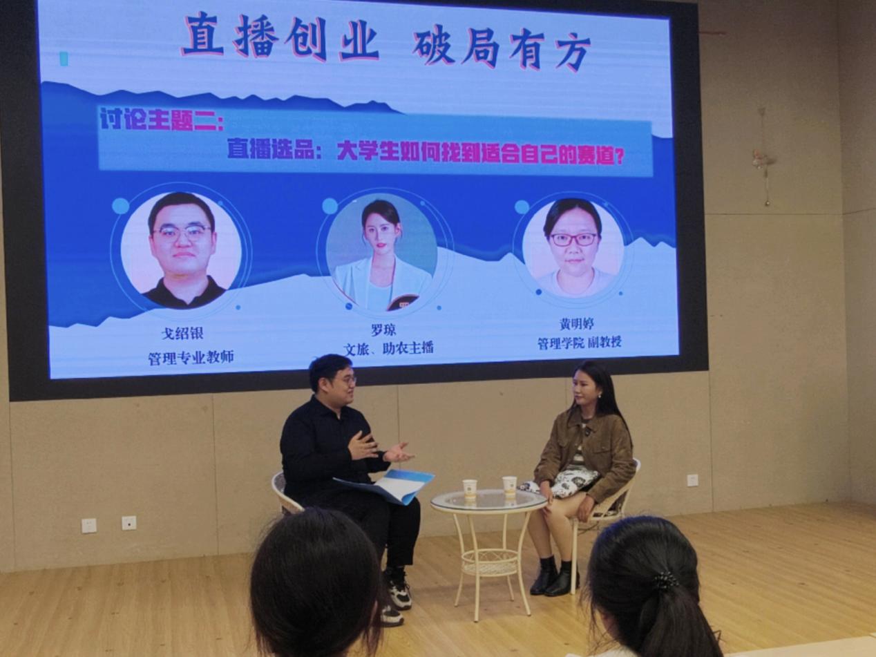 随后,专业主播罗琼与高校教师戈绍银开展了一场圆桌对话。二人围绕“短视频的‘下半场’:普通创作者还有机会吗?”、“直播选品:老员工如何找到适合自己的赛道”与“‘一人直播’VS‘团队作战’:如何低成本组建团队”三大核心议题,从学界与业界的不同视角出发,交流观点、碰撞思想。这场对话不仅搭建起“学界+业界”的交流桥梁,也为直播创业领域的产学研融合探索了新形式,切实帮助同学们将“创业想法”落地为“可执行方案”。