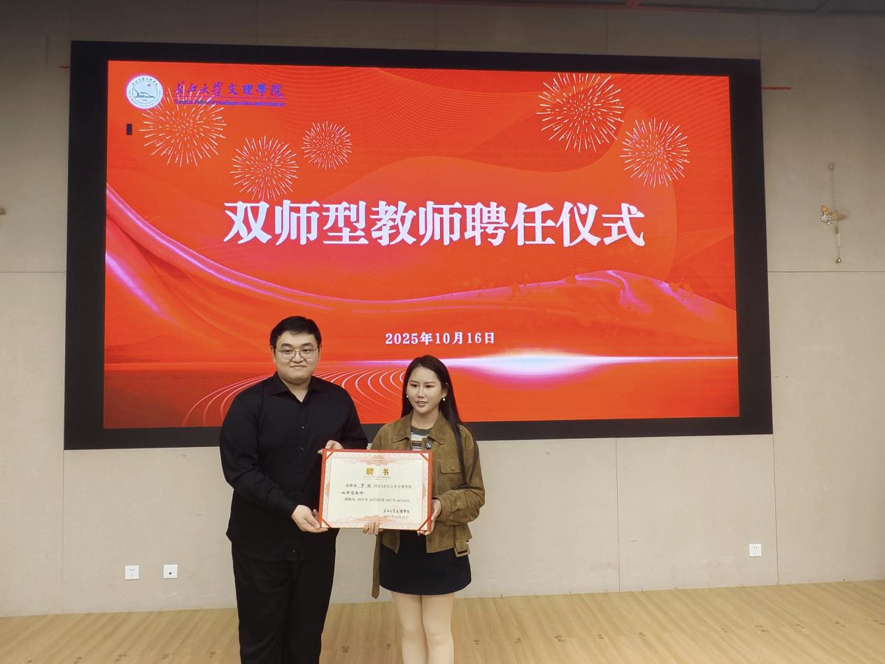 最后,管理学院还举行了双师型教师聘任仪式,罗琼被正式聘任为学院双师型教师。在聘任仪式上,学院为罗琼颁发了聘书,期待她能够将丰富的行业实践经验融入到学院的教学工作中,助力学院培养更多适应行业需求的应用型人才,推动学院实践教学再上新台阶。
