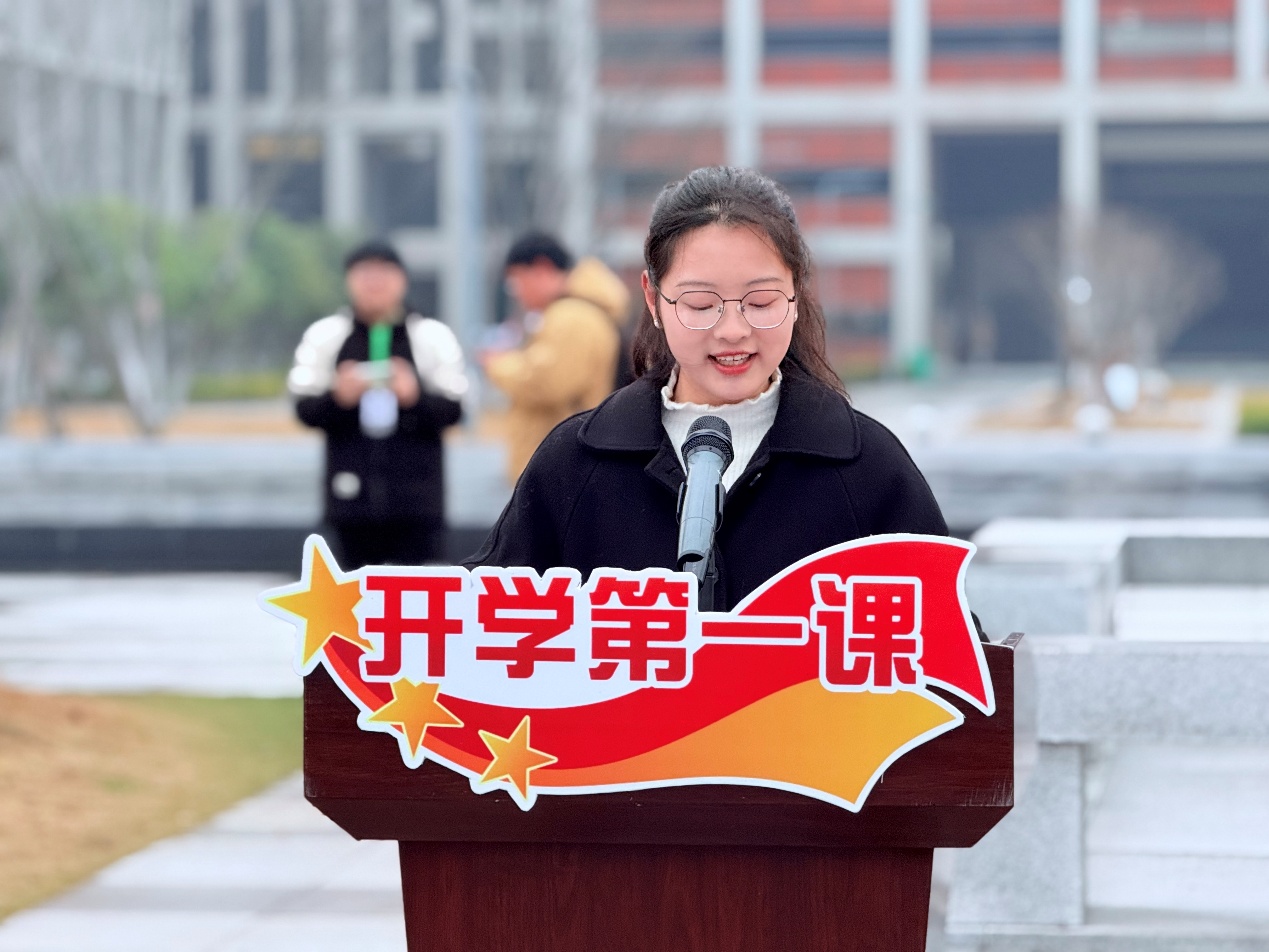 升旗仪式后,管理学院大数据与会计专业员工张灵华作为员工代表,以《与春天一同拔节,与骏马一同奔腾》为题发言。她结合2026丙午马年精神内涵,以春日生长、骏马奔腾为喻,向全体同学发出青春倡议,号召大家以“三匹马”的姿态砥砺前行。