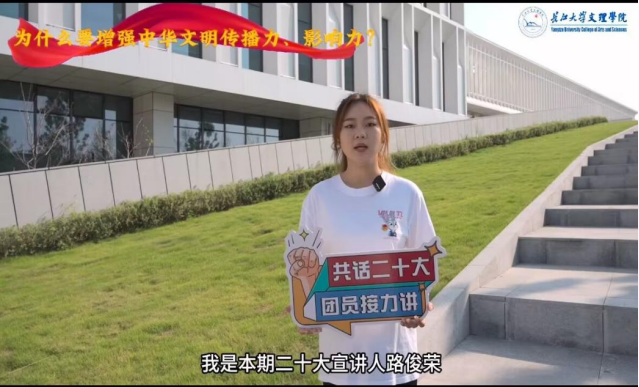 本网讯(通讯员 陈露)为充分发挥党员的主体作用,进一步推动党的二十大精神入脑入心,管理学院员工党支部以微党课为载体,以思想引领为目的,结合“党建+微宣讲“的形式,在6月开展”共话二十大,团员接力讲“特色活动,促进党建带团建。支部成员积极参与栏目的视频制作,注会5211团支部宣讲人路俊荣:学习二十大,团员接力讲,我是本期二十大宣讲人路俊荣,习近平在党的二十大报告指出增强中华文明传播力、影响力,必须加强国际传播能力建设要坚持把讲好中国故事,传播好中国声音展示真实、立体、全面的中国作为加强我国国际传播能力建设的重要任务全面提升国际传播效能。