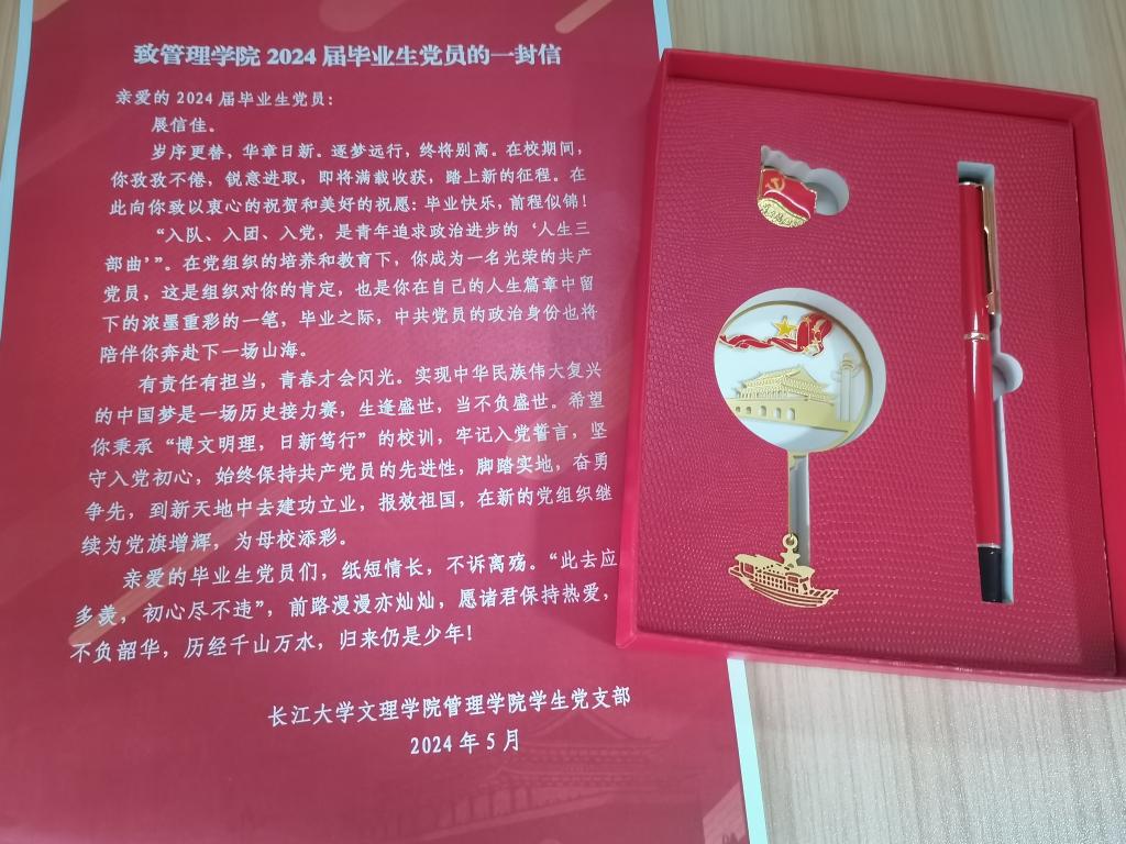 本网讯 近日,管理学院的毕业生党员收到一份特殊的政治生日礼物:一个红船初心书签、一枚党徽、一支党性笔,与这份党徽套装一同送到毕业生党员手里的,还有《致管理学院2024届毕业生党员的一封信》。管理公司党总支为加强员工党员的党性教育,引导毕业生党员发挥先锋模范作用,做好表率,在员工支部中开展了“再上一次党课,过一次政治生日”的党员教育活动。