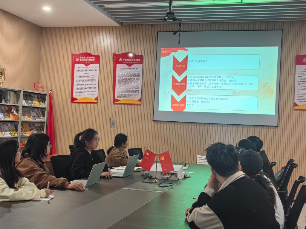 会上,何培茹同志就入党流程和材料格式进行了详细的讲解,着重讲述了班级联系人的工作职责。在入党流程方面,要认真向班级入党积极分子讲述入党具体流程,包括入党积极分子、拟发展对象、发展对象、预备党员、正式党员;同时,积极鼓励、引导他们积极参与学院活动。在材料格式方面,何培茹同志以遇到的典型问题为例,针对书写材料时遇到的各种问题进行详细讲解,提出班级联系人要积极督促入党积极分子严格按照要求书写入党申请书、思想汇报以及党章学习心得。