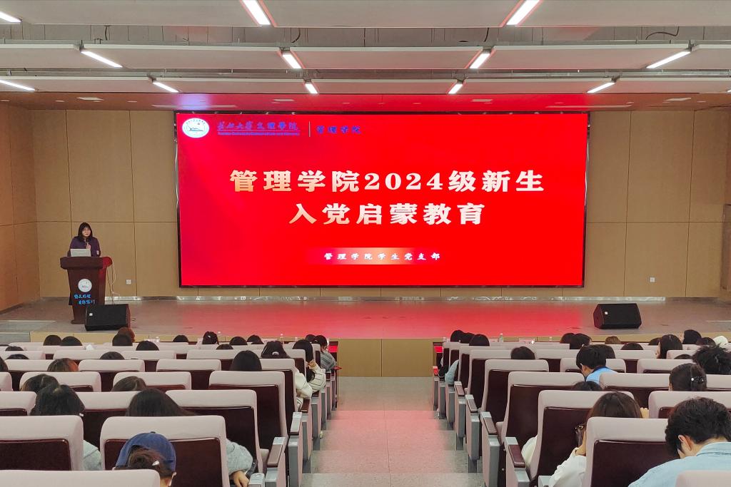 会上,杨琪老师通过介绍管理学院员工党支部的组织架构、所获奖项以及丰富多彩的主题党日活动,全方面展示了管理学院员工党支部这个大家庭的热情与活力。接着,杨琪老师引导同学们要端正入党动机,坚守入党初心,并向大家详细讲解了发展党员的基本要求、基本流程和常见问题,指明了新生向党组织靠拢的前进方向,并鼓励同学们要勇于展示自己,以实际行动向党组织靠拢。在最后,杨琪老师深情勉励在座的新生:“同学们,大学是人生中最宝贵的时光,也是你们成长成才的关键时期,希望大家能够珍惜这段时光,积极向党组织靠拢,在党的培养下,努力成为有理想,有道德,有文化,有纪律的社会主义建设者和接班人。”