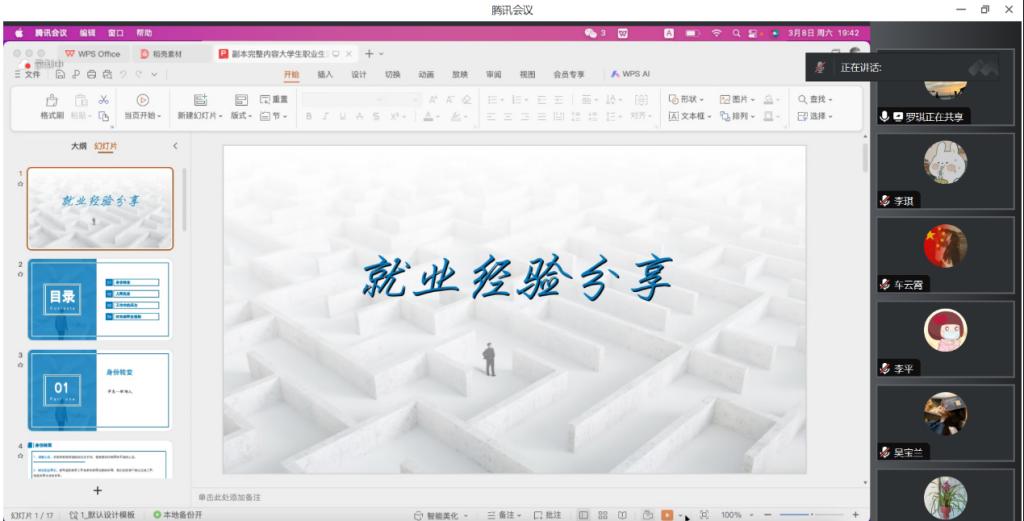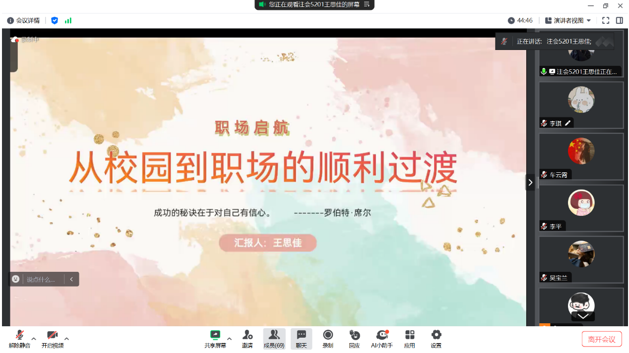 接着,罗琪学长从四个方面分享了他的求职心得。在顺利完成对员工到职场人的角色转换中,我们要对自己有一个明确的位置感和自我认知。在人际交往的领域,学长以自身的职场经验为例,给出了几点建议:我们要保持良好的形象,在日常生活中积极与同事进行交流沟通。我们要学会专注地倾听他人的观点和见解,并给予恰当的反馈与回应。当同事遇到困难时,我们应在自己的能力范围内伸出援手,共同协作,确保任务的顺利完成。学长特别提醒大家,对于未来的职业规划必须有一个清晰的认识。无论是专业知识的深入学习,还是相关资格证的获取,以及参加竞赛活动,都应与自己的职业发展规划相得益彰,形成有力的支撑。