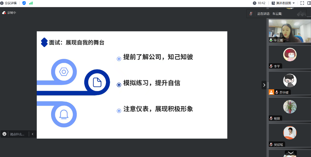 首先发言的是车云霄学姐,她从简历制作、面试技巧等方面进行了详细讲解。她强调,简历是求职的敲门砖,要针对岗位定制简历,调整简历的内容和侧重点,确保简历与岗位需求高度匹配,要简洁明了,突出亮点,让用人单位一眼就能看到你的价值。在面试环节,她建议同学们提前了解企业文化和岗位要求,不断地提前演练,模拟练习,做到有备无患。在面试时保持自信,回答问题要条理清晰,展现出自己的逻辑思维能力和沟通能力。同时就企业在招聘面试时更看重哪方面的能力和最容易被认可的校园经历与在线的学弟学妹们进行了深度的探讨。