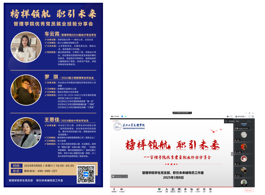 此次管理学院优秀党员就业经验分享会的成功举办,充分展示了管理学院员工党员学子的风采,也激励了大家以优秀党员为榜样,合理规划自己的未来职业生涯。今后,管理学院将继续举办此类活动,助力更多学子实现人生价值,为我国经济社会发展贡献青春力量。