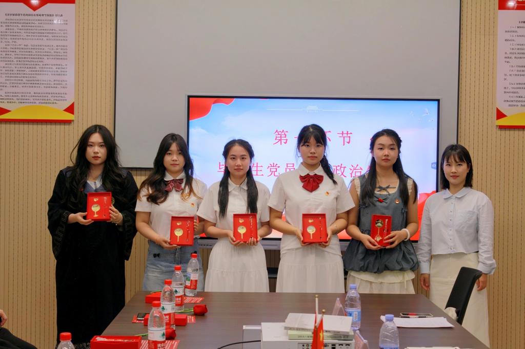 随后,全体成员移步会议室。在庄严氛围中,吴鑫瑞同志领誓,全体党员重温入党誓词。铿锵誓言彰显了毕业生党员不负组织重托、永葆政治本色的坚定信念。宣誓结束后,不少党员轻抚胸前的党员党徽,目光坚毅,展现出毕业生党员以誓言为镜、以使命为舵,在新征程中勇毅前行的决心。