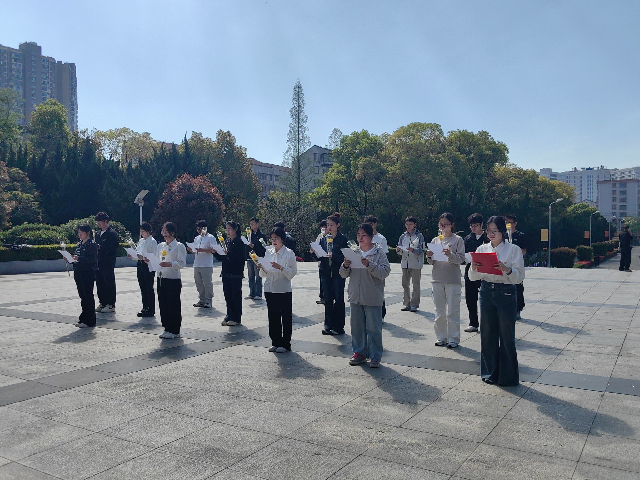 默哀结束后,员工党员代表作了题为《清韵寄思祭英烈,青春砺志践初心》的主题演讲,深情讲述了长眠于此的547名烈士的感人事迹,号召全体党员继承先烈遗志,勇担时代使命。随后,全体同志齐声朗诵诗歌《清明·沙市英魂》,以铿锵诗句表达对英烈的告慰与砥砺奋进的决心。