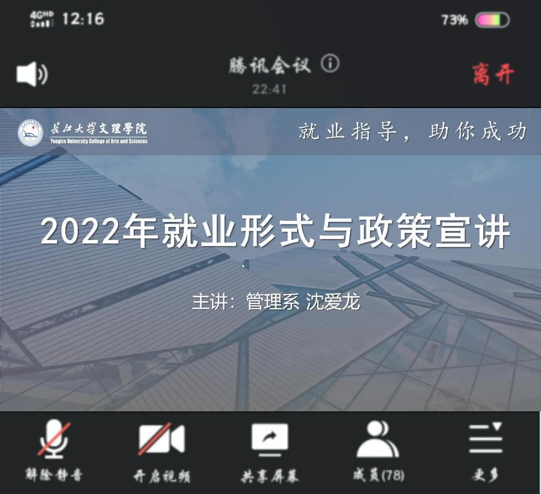 本网讯(通讯员 罗青玲)5月12日上午,我系举办了线上的2022就业形势与政策宣讲 ,管理系党支部书记沈爱龙为同学们详细介绍了当今的就业形势是什么、为什么要了解形势以及就业的注意事项等,在最后他还结合实际为同学们介绍了毕业发展的方向和就业流程。
