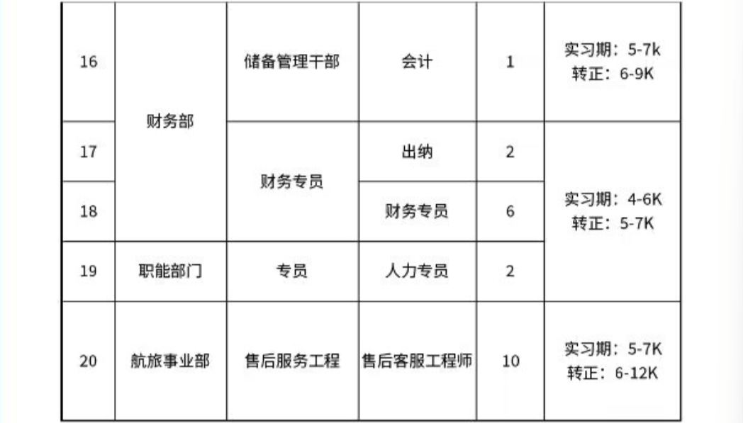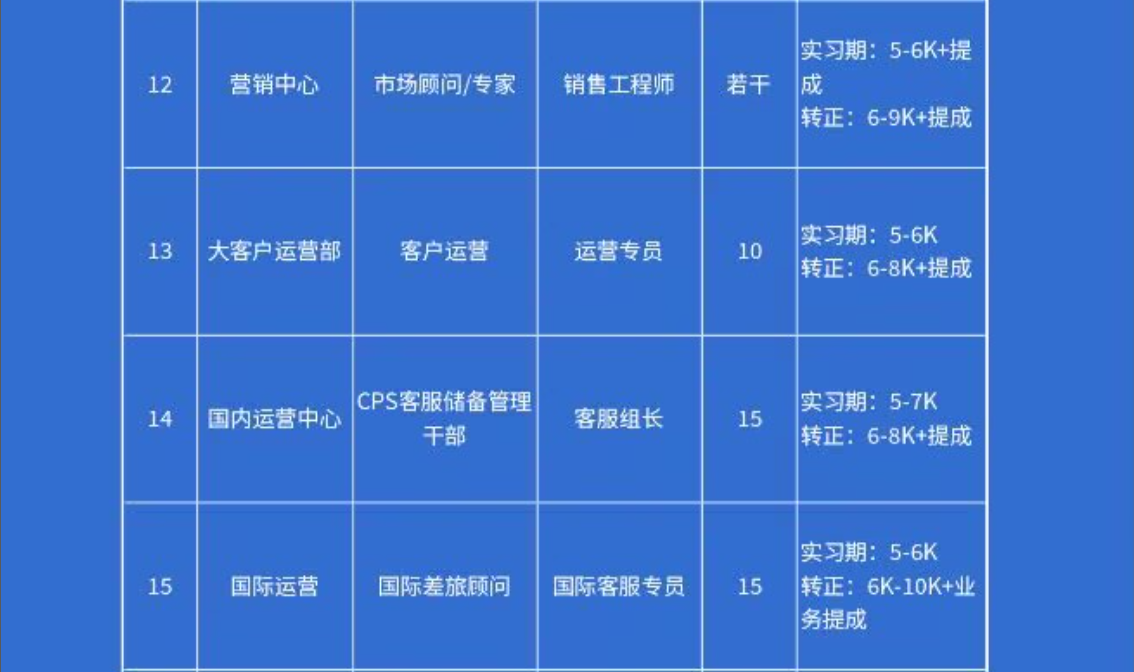 客户服务类:实习期:4-7K;转正:6-8K+提成职能类:实习期:4-6K;转正:5-8K