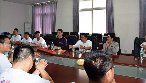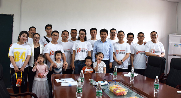 孙细望(左四)、陈元芳(左六)、冉继强(左五)和员工们共话母校发展
