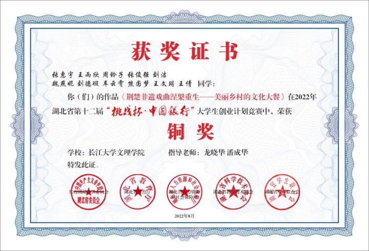 2022年8月,获湖北省“挑战杯”大赛铜奖,通过初级会计资格考试