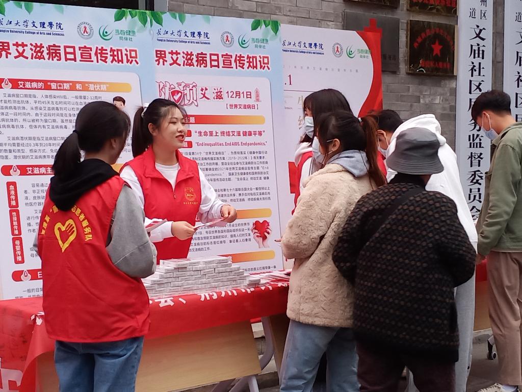 本网讯(通讯员 夏欣)12月1日是第34个“世界艾滋病日”,为推动大众对艾滋病有较为正确的了解,11月25日青春健康志愿者服务队分别在文庙社区、城中校区开展了预防艾滋病主题宣传活动,号召和呼吁广大居民和在校青年老员工用科学、理性的态度正确认识艾滋病。