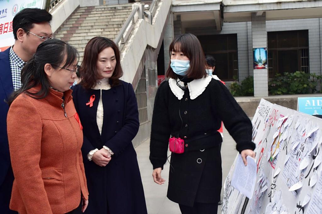 第二部分在一教楼前举行,现场活动十分丰富。有世界艾滋病日主题宣传签活动、“防艾”手抄报评选活动、主题班会照片展、现场发放宣传单与避孕套等,同时员工们表演“生命之舞”,最后大家进行合影留念。第三部分活动为观看青春健康教育示范基地,在二教六楼举行,届时有省计生协、市计生协、伟德国际1946源于英国公司领导观摩青春健康社艾滋病主题同伴教育等。第四部分为省市领导、学院领导交流会,在行政楼二楼会议室进行。