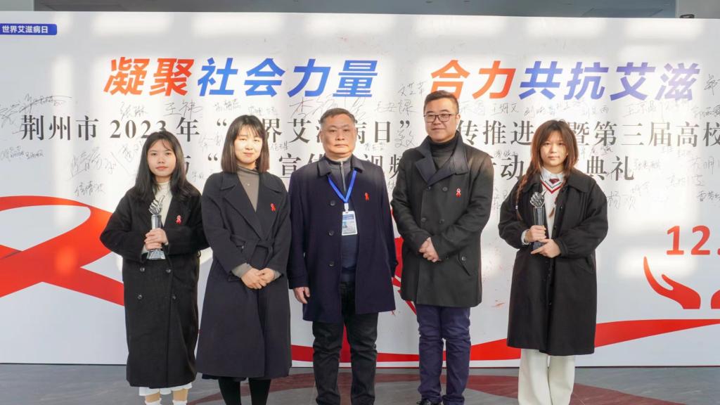 本次防艾短视频的拍摄,主要由一个同学扮演“艾”另一个扮演“爱”用爱来感化艾,传达联合爱预防艾的思想。片中涉及了艾滋病的传播途径、预防知识和患者心理等多个方面内容,形式多样,内容丰富。参与本次拍摄的同学也很多,虽然只是一个过路的小角色同学们也都演的格外认真。该宣传片通过校园网络、新媒体等多种渠道进行广泛传播,以引发更多人对于艾滋病预防的关注和参与。同时社团也将防艾短视频投稿参加了荆州市防艾短视频比赛,荣获三等奖,由胡沿林老师,王可好同学代为参加颁奖典礼替社团全体同学领奖。