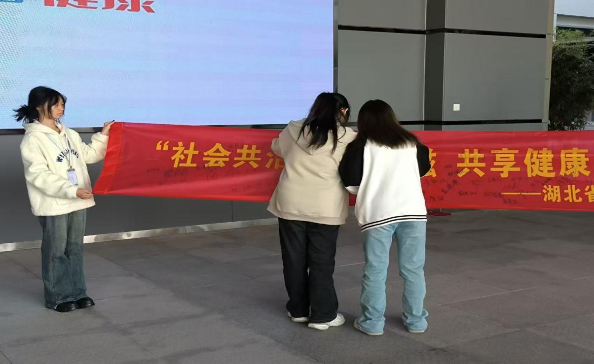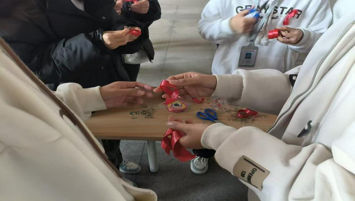 活动开始前,成员们带上了利用红丝带制作简易的胸针,并在“社会共治”的横幅上签下自己的名字,体现出社员们对本次活动的热情。