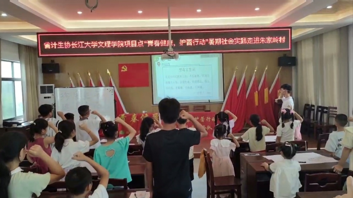 在朱家岭村,志愿者与当地民警为当地的小朋友们带去了一场意义非凡的禁毒教育主题活动,加深了小朋友们关于毒品的认知与毒品的危害。小朋友们踊跃参与,积极配合,大声的向志愿者们表达出对毒品坚决说“不”的看法,并与志愿者进行了禁毒宣誓。禁毒宣誓环节,孩子们表情严肃,嗓音明亮,小小的身躯内蕴藏着与毒品作斗争的坚毅的能量。