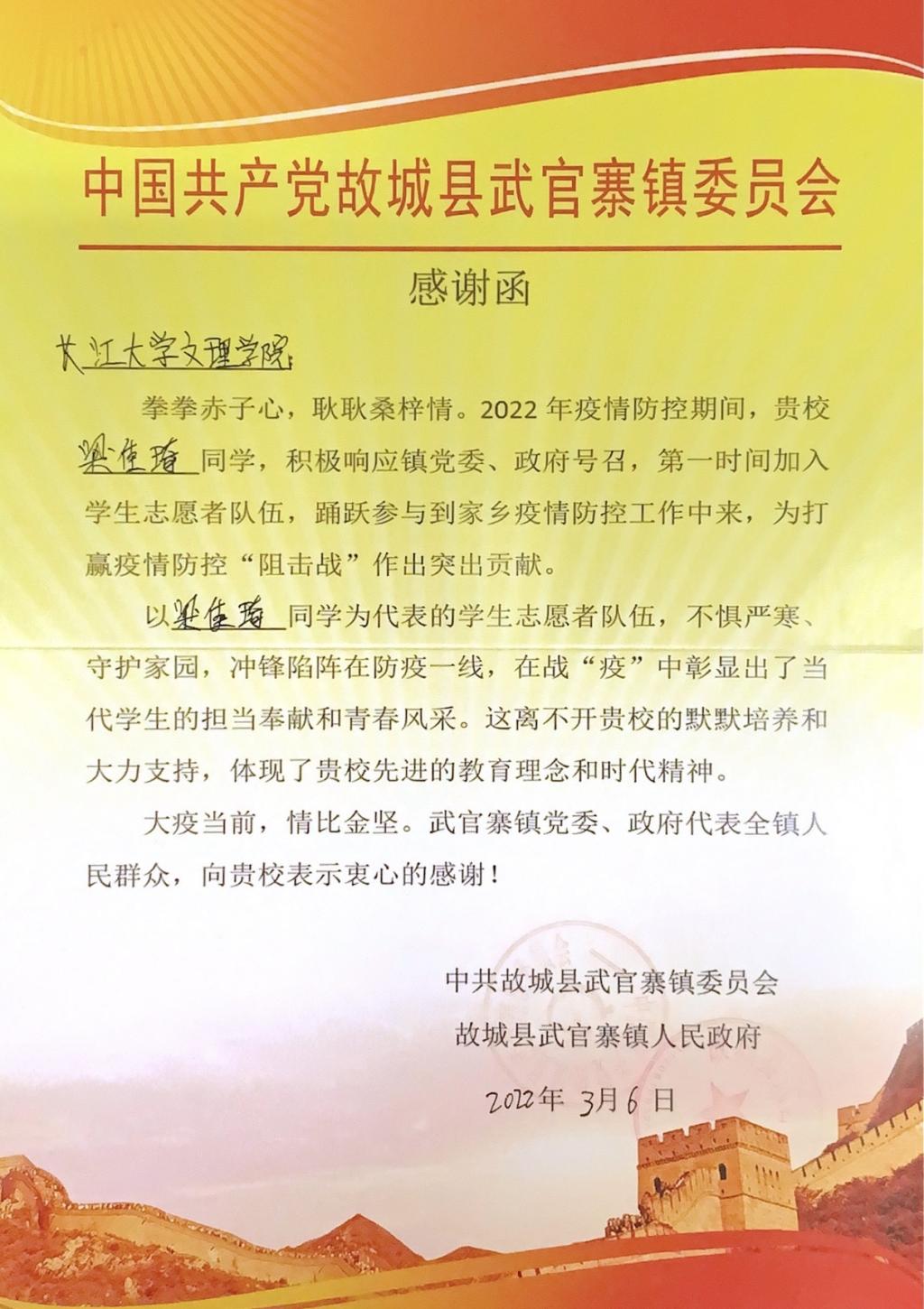 本网讯(通讯员 黄婷婷)近日,中共故城县武官赛镇委员会、故城县武官寨镇人民政府发来感谢函,对我系小教5215班梁佳琦同学积极参与当地疫情防控,为地方新冠疫情防控工作贡献力量的行为予以表彰。