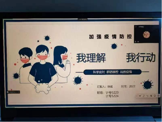 班会内容分为理性认知,科学防护,勇担责任,处分暂规四个板块,着重强调了当前疫情防控正处于关键时期,请同学们要继续保持警惕,非必要不出校,在校园内要佩戴口罩出行。各班班长以“面对疫情同学们应该怎么做”为话题展开了讨论,同时就个人卫生、作息时间等方面做了以下要求:在保证自身安全的前提下,不耽误学业,按时上下课,遵守防疫政策,服从学校安排。同学们纷纷表示,会积极配合学校采取的封闭式管理,做好个人防护,与学校一起面对这场没有硝烟的战争,为自己提供健康安全的学习及生活区域。