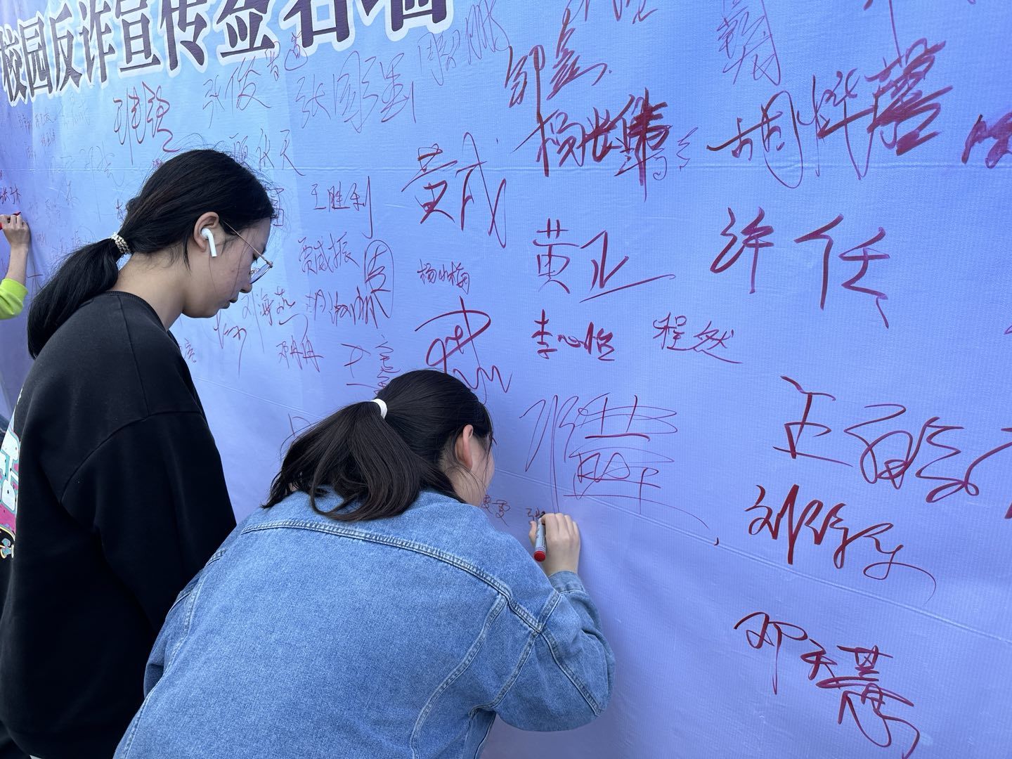 现场区公安局反诈中心王警官以案例讲解等形式向同学们介绍网络诈骗类型的本质及特点,以身边实例向大家介绍网络兼职刷单诈骗、冒充熟人诈骗、网络贷款诈骗、冒充电商物流客服诈骗等老员工容易上当的电信网络诈骗陷阱,以案释法,揭露诈骗分子常用的诈骗伎俩,提出了有针对性的防范措施。讲座过后同学们在现场横幅上签名,在留言墙上通过便利贴做出“安全牢记于心”的承诺。