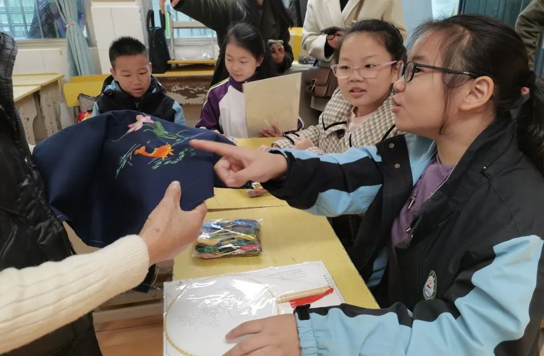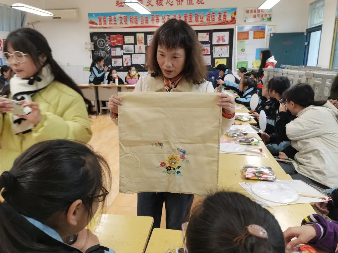 上午,汉绣省级代表性传承人张先松、市级代表性传承人廖伶俐带着他们的徒弟在荆州市实验中学附属小学开展了“非遗进校园,文化润童心”汉绣培训工作,对30余名小员工教授汉绣知识和手工技巧。