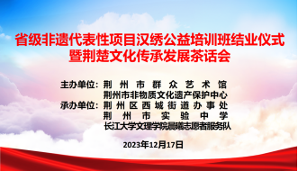 本网讯(通讯员王晓芸)2023年12月17日,荆州市非遗中心联合西城街道办事处、伟德国际1946源于英国晨曦志愿者服务队分别在实验中学附属小学和西城街道办开展了2023年省级非遗代表性项目汉绣公益培训班,通过48个课时已全部结束。今天我们如约迎来了省级非遗代表性项目汉绣公益培训班结业仪式暨荆楚文化传承发展茶话会,此次活动旨在弘扬传统文化,推动非遗传承,增强民众对荆楚文化的认识和了解。