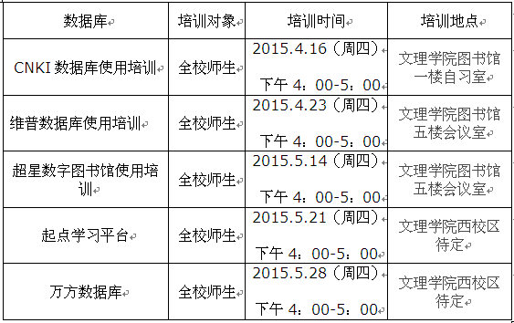 为了配合本校师生教学与科研的需要,有效提高本馆已购数据库及试用数据库的使用,图书馆参考咨询部特邀请相关专家讲解CNKT、超星数字图书馆、起点、维普、万方等数据库使用方法和检索技巧,分别于4月16日、4月23日、5月14日、5月21日、5月28日等周四下午,在公司举办系列讲座,帮助广大师生学会查找各类中外文文献资料的方法,提高个人获取学术信息的能力。望广大读者踊跃参加!