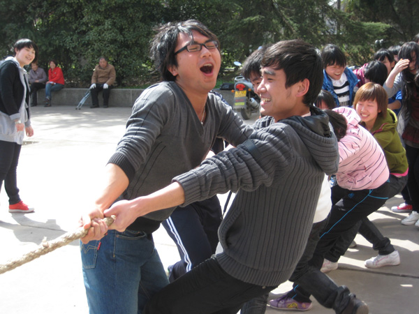 据胡老师介绍,此次拔河比赛是基础学部中文系2010年系列活动之一,接下来还将举行演讲比赛、“三笔字”书法比赛、羽毛球比赛和桃花村踏青活动等,让同学们在活动中增进友谊,加强沟通。